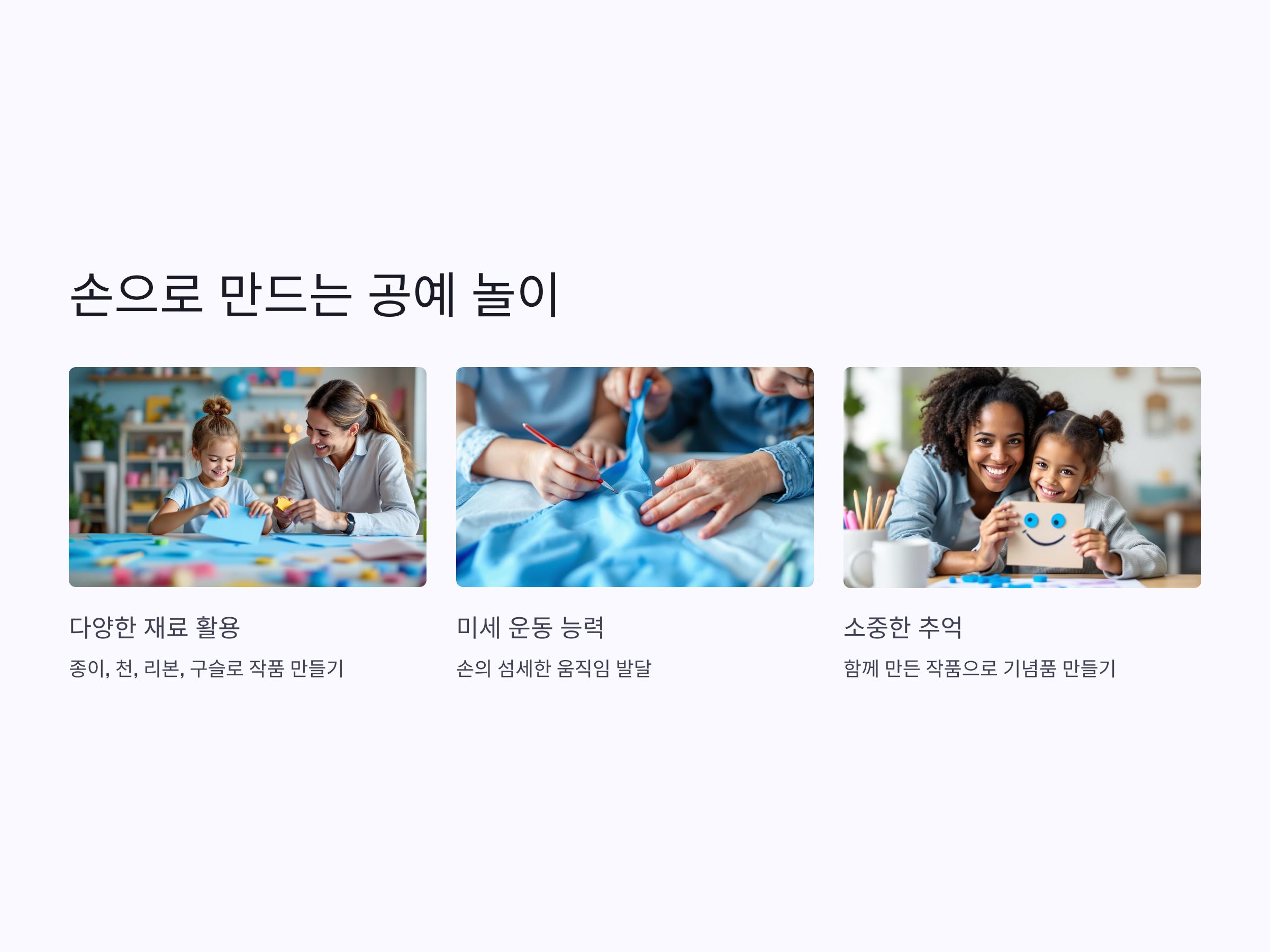 공예 놀이를 통해 손주와 함께 만드는 작품은 그 자체로 값진 추억이 됩니다. 할머니와 할아버지가 손주와 함께 만든 작품은 시간이 지나도 소중한 기념품이 되어, 미래에 다시 돌아봤을 때 행복한 기억을 떠올리게 해 줄 것입니다.