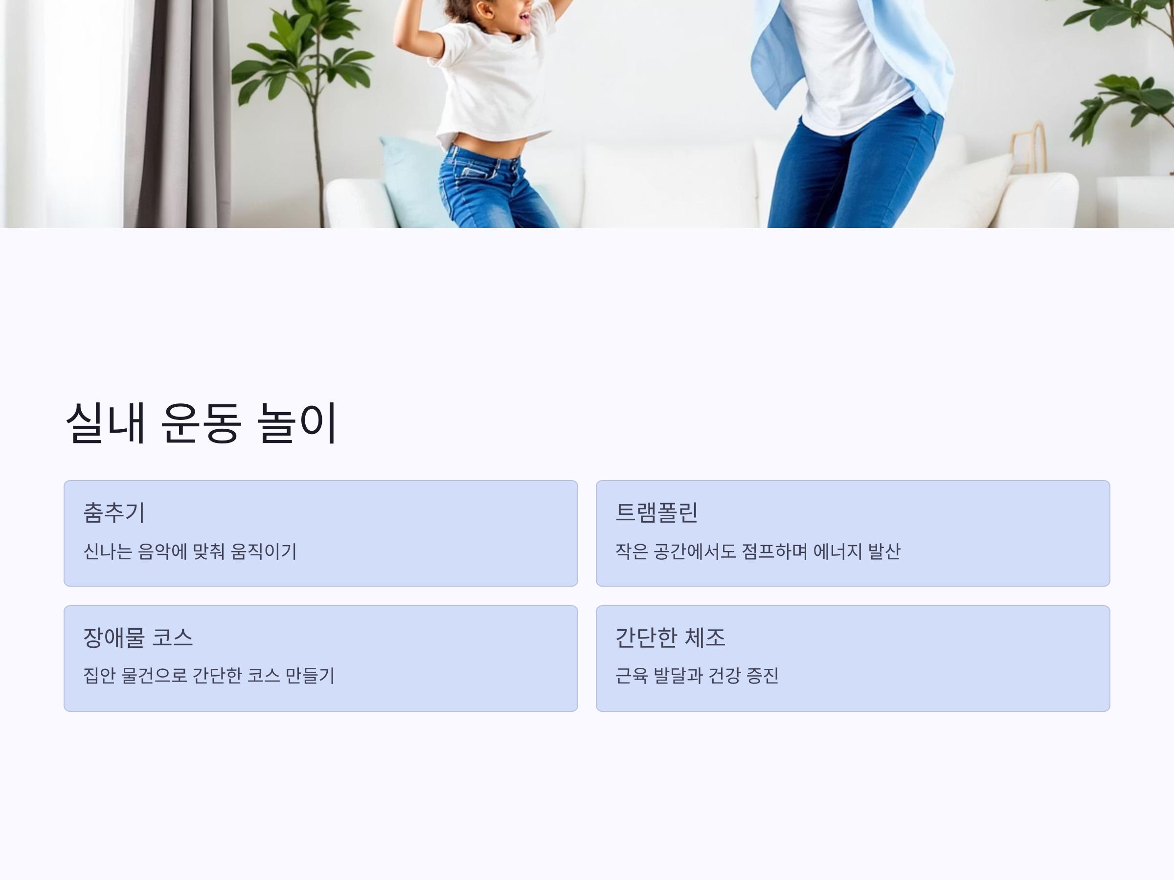 손주가 활동적인 성향을 가지고 있다면 실내에서도 쉽게 할 수 있는 운동 놀이를 추천합니다. 공기청정기나 작은 공간에서도 충분히 즐길 수 있는 실내 운동 놀이로는 춤추기, 트램폴린 점프, 또는 작은 장애물 코스를 만드는 것이 있습니다. 이를 통해 손주는 신체 발달을 촉진하며, 에너지를 효과적으로 발산할 수 있습니다.