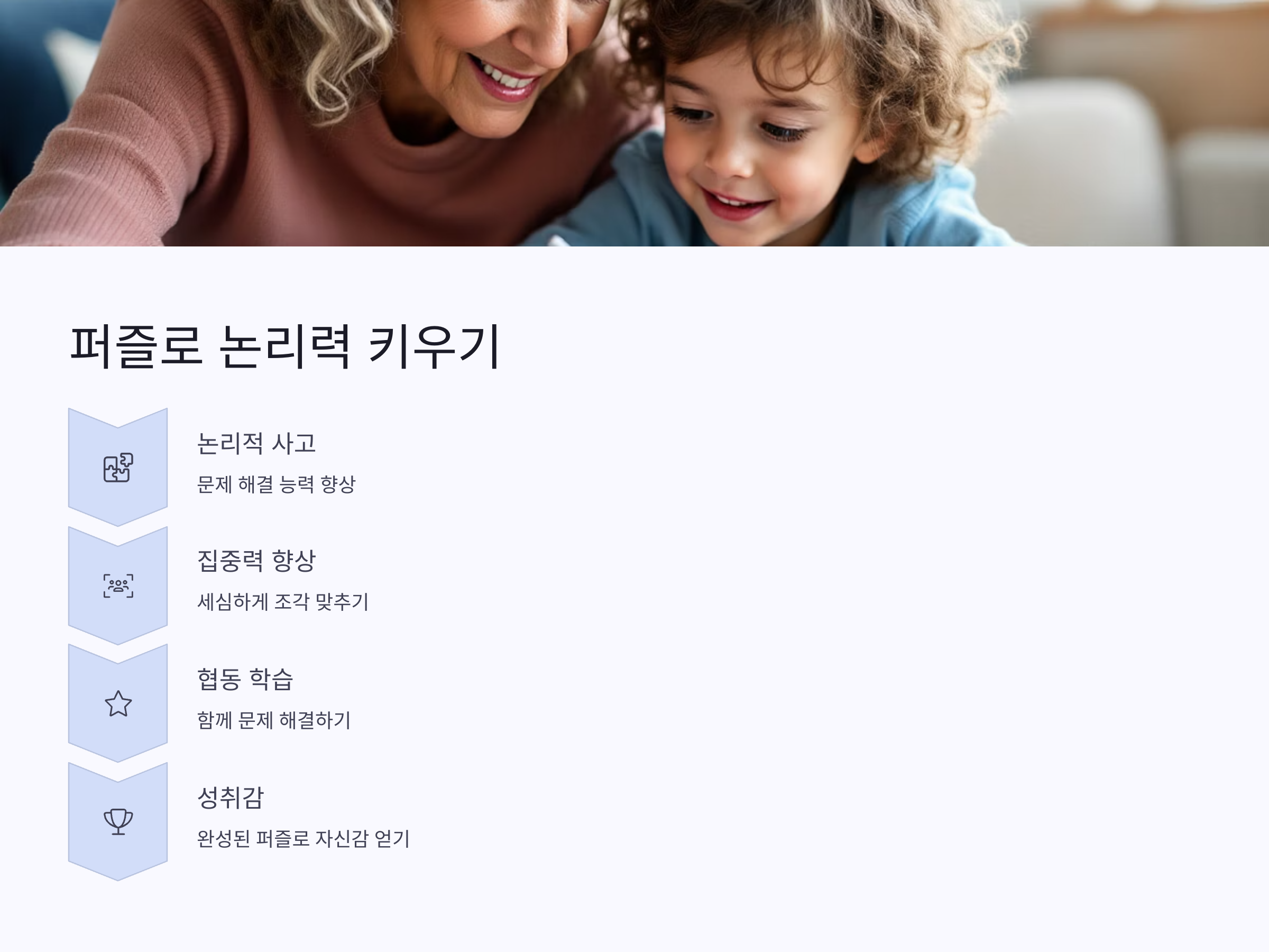 퍼즐은 또한 손주가 세심하게 조각을 맞추며 집중력을 향상시키고, 협동적인 문제 해결을 할 수 있게 돕습니다. 완성된 퍼즐을 보며 성취감을 느끼는 손주의 모습을 보면, 부모와 조부모 모두 만족감을 느낄 수 있습니다.