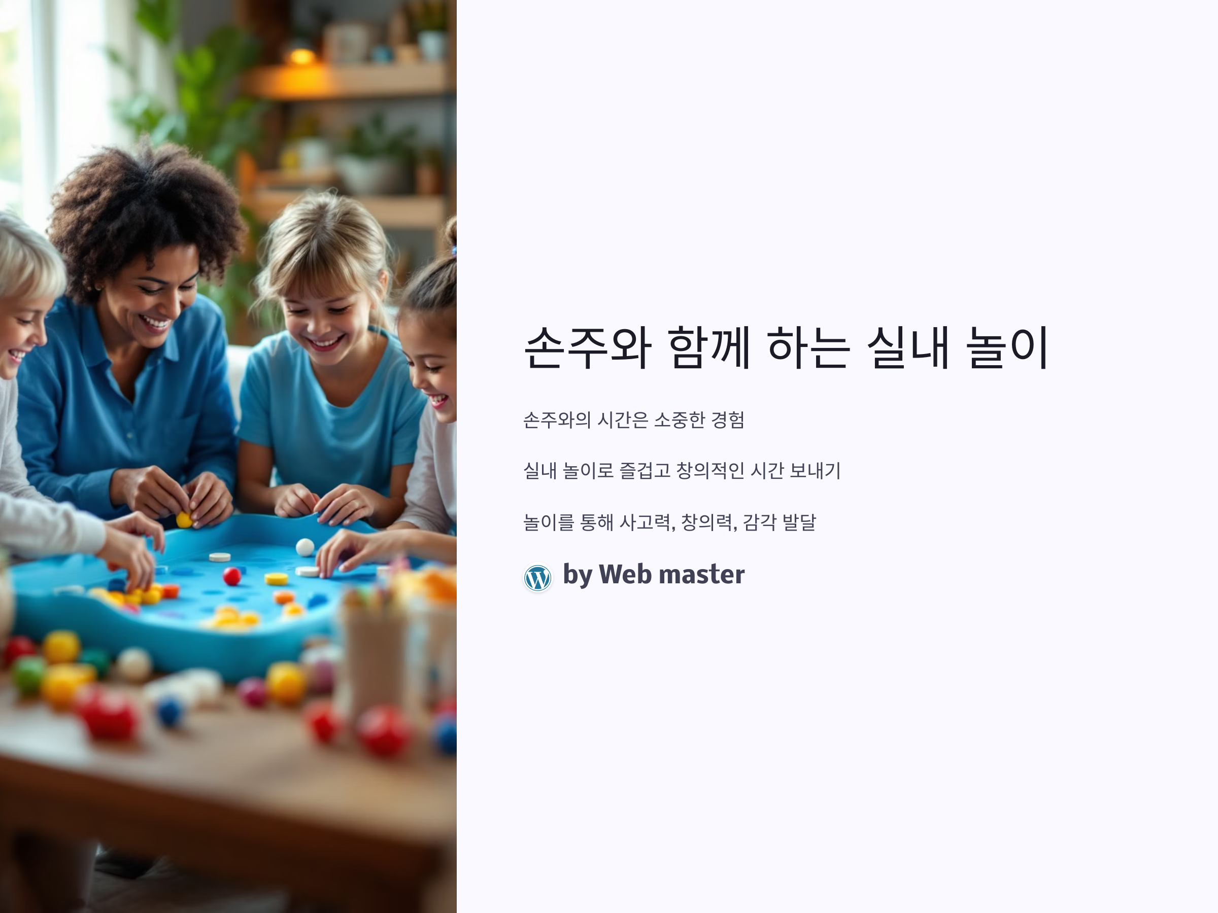 손주와 함께 하는 실내 놀이는 단순히 시간을 보내는 것이 아니라, 아이의 발달을 도우며 소중한 유대감을 형성하는 중요한 시간입니다. 위에서 소개한 다양한 놀이들은 손주가 창의력을 기르고, 사고력과 사회성을 발전시킬 수 있는 방법입니다. 이 놀이들을 통해 손주와 함께하는 시간은 더욱 의미 있고 즐겁게 만들 수 있습니다.
