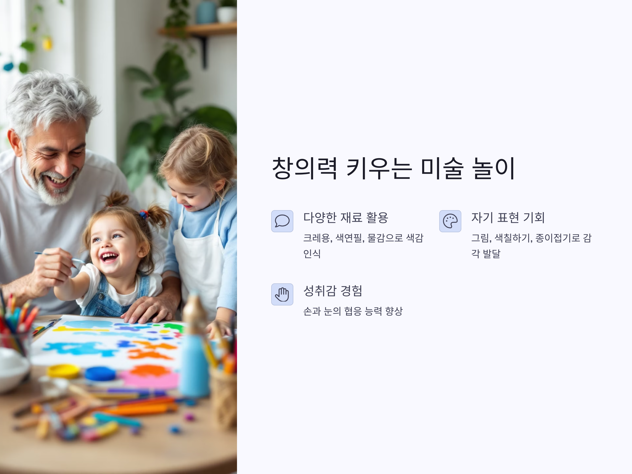 미술 놀이는 손주가 창의력을 발휘할 수 있는 최고의 방법 중 하나입니다. 크레용, 색연필, 물감 등을 활용한 미술 활동은 손주가 색감과 형태를 인식하는 데 큰 도움이 됩니다. 간단한 그림 그리기부터 시작해 색칠하기, 종이접기까지 다양한 활동을 통해 손주와 함께 즐겁게 시간을 보낼 수 있습니다.