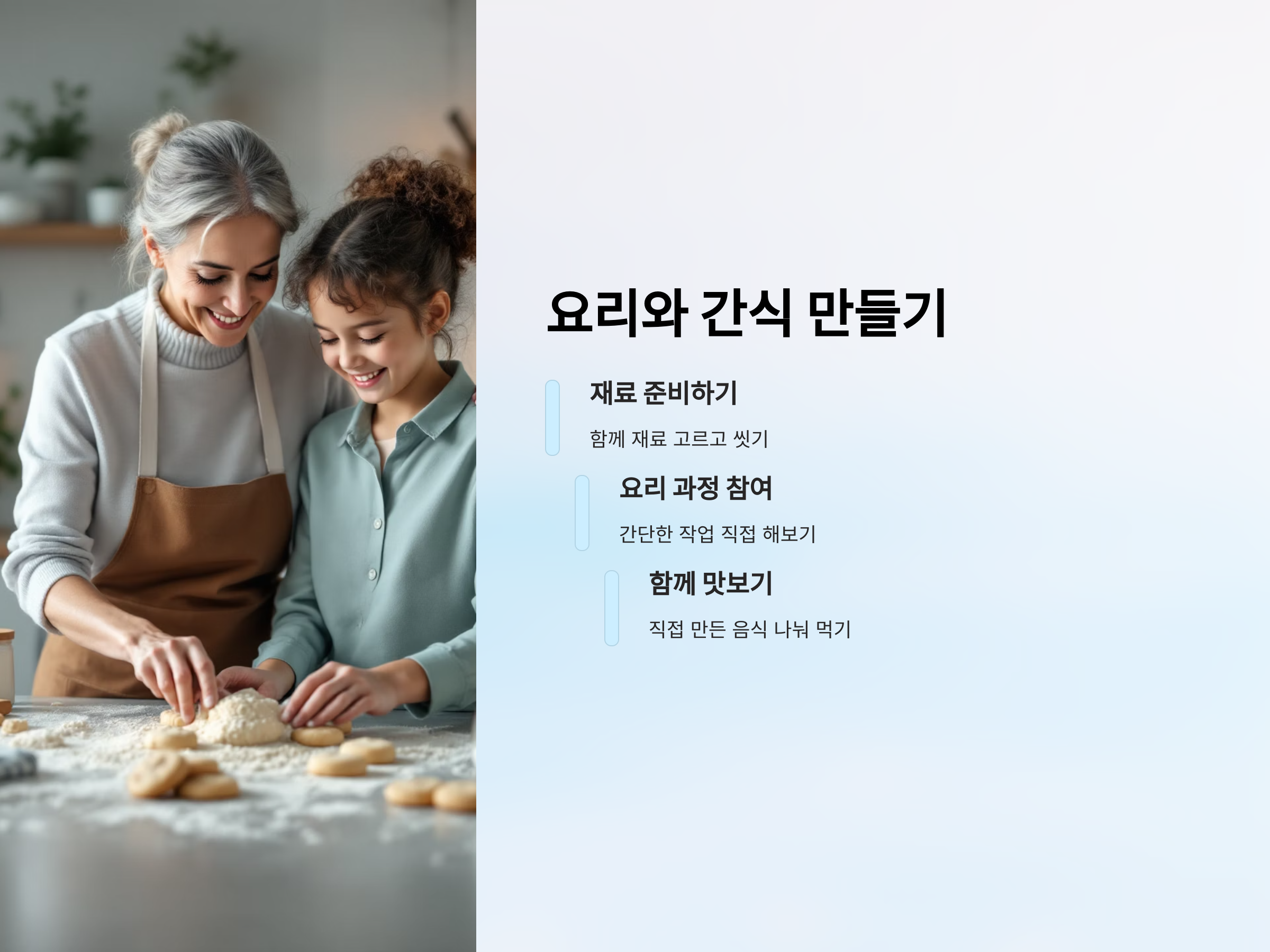 이때, 손주는 자신이 만든 음식을 맛보며 큰 만족감을 느끼고, 음식에 대한 관심도 커질 것입니다. 함께 만든 음식을 나누는 순간은 따뜻하고 사랑이 넘치는 시간을 만들어줍니다.