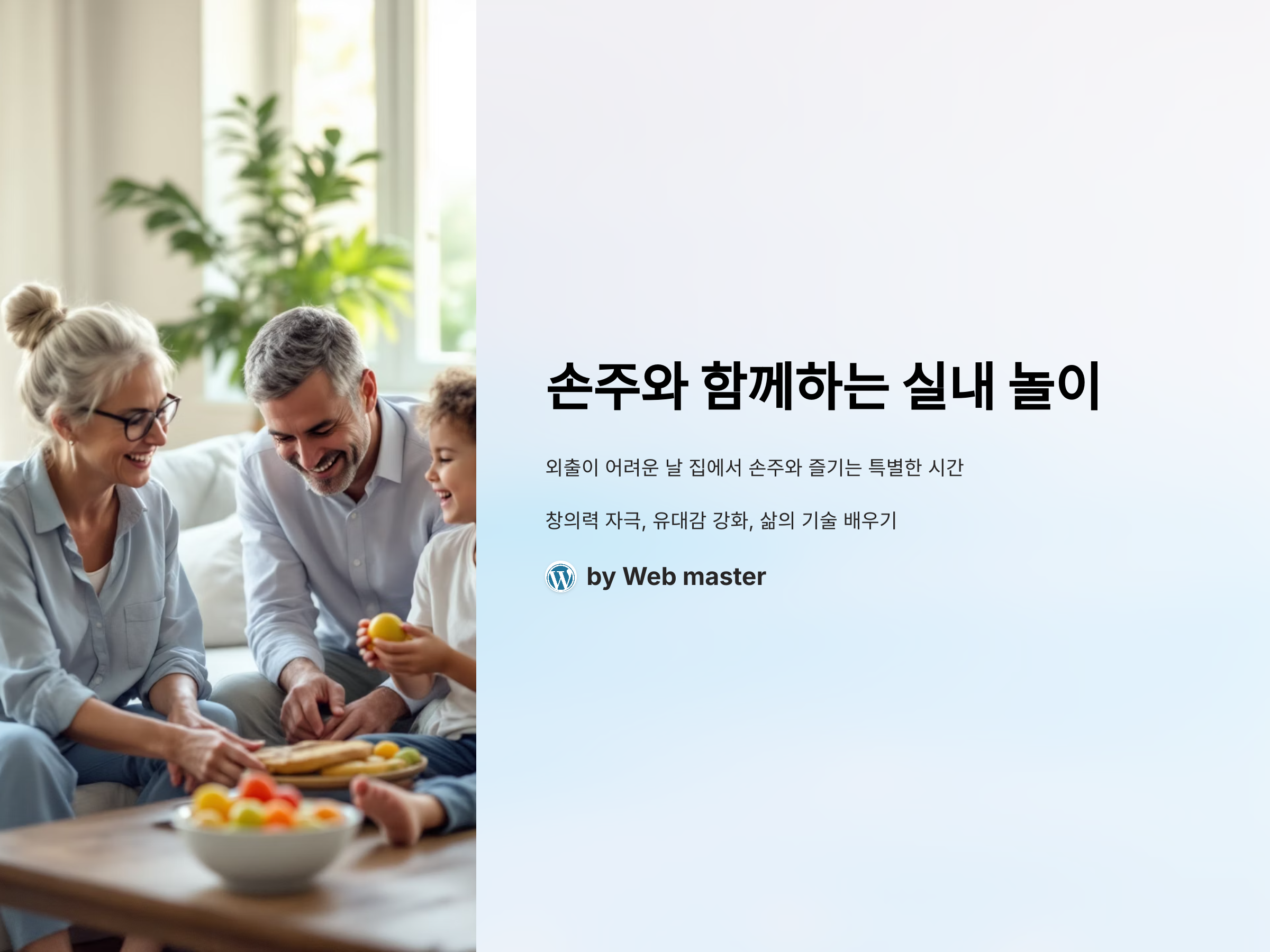 손주와 함께하는 시간은 그 어떤 시간보다 특별합니다. 특히 외출이 어려운 날이나 날씨가 좋지 않은 날에는 집에서 함께 즐길 수 있는 실내 놀이를 찾는 것이 중요합니다. 실내 놀이를 통해 손주와의 유대감을 더욱 강화하고, 창의력을 자극하며, 중요한 삶의 기술들을 자연스럽게 배울 수 있습니다. 여기 손주와 함께하면 즐거운 실내 놀이 아이디어들을 소개할게요.