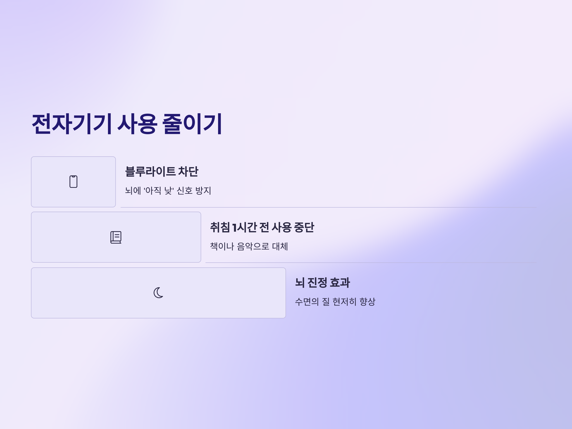 잠자기 최소 30분에서 1시간 전에는 전자기기 사용을 피하는 것이 좋습니다. 대신 책을 읽거나 편안한 음악을 듣는 등의 방법으로 뇌를 진정시킬 수 있습니다. 전자기기 사용을 줄이면 수면의 질이 현저히 향상됩니다.