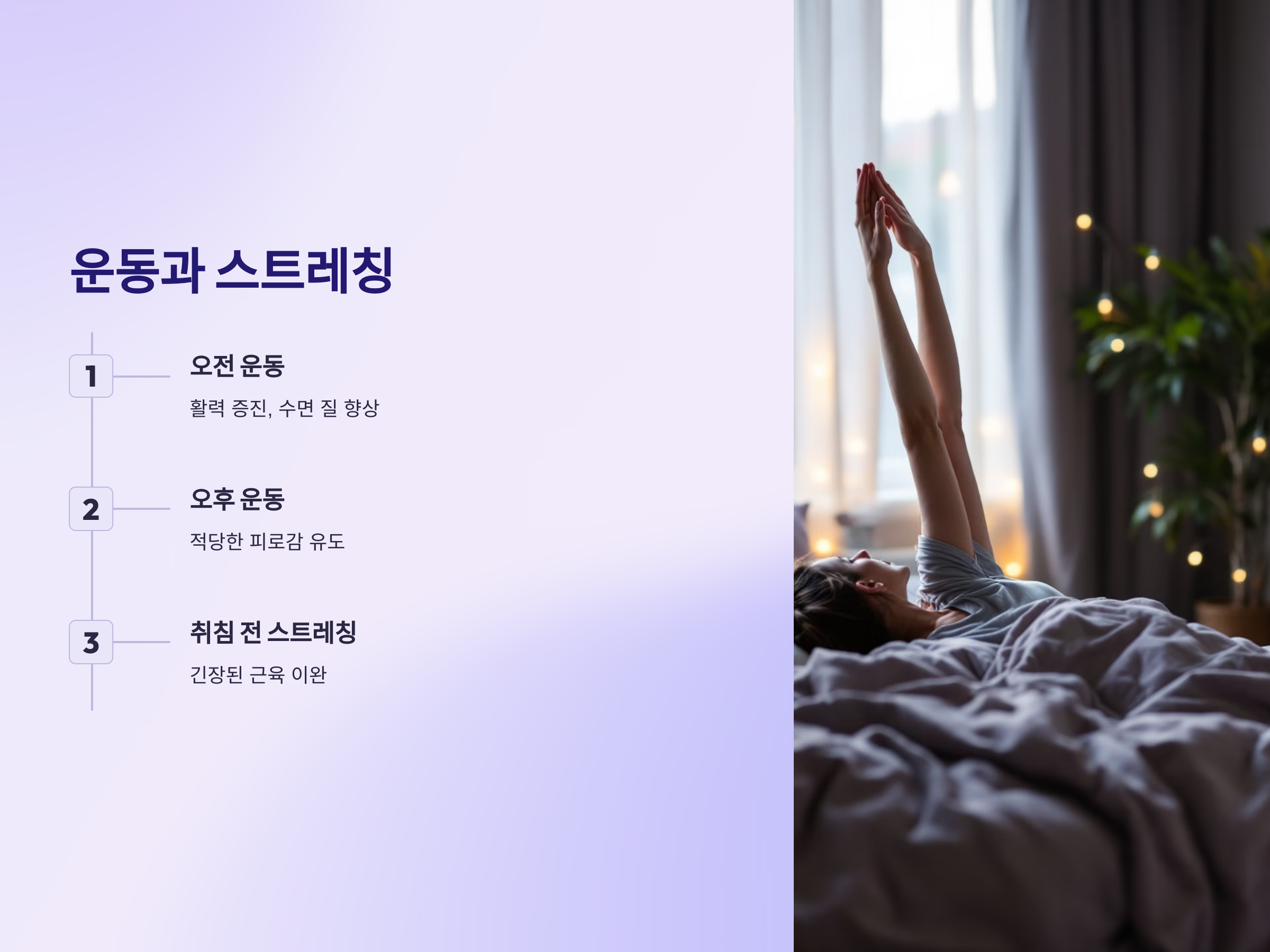이와 함께, 정신적으로 스트레스를 해소하는 것도 중요합니다. 스트레스를 관리하고 평온한 상태로 잠자리에 든다면, 더 깊고 회복적인 수면을 취할 수 있습니다.