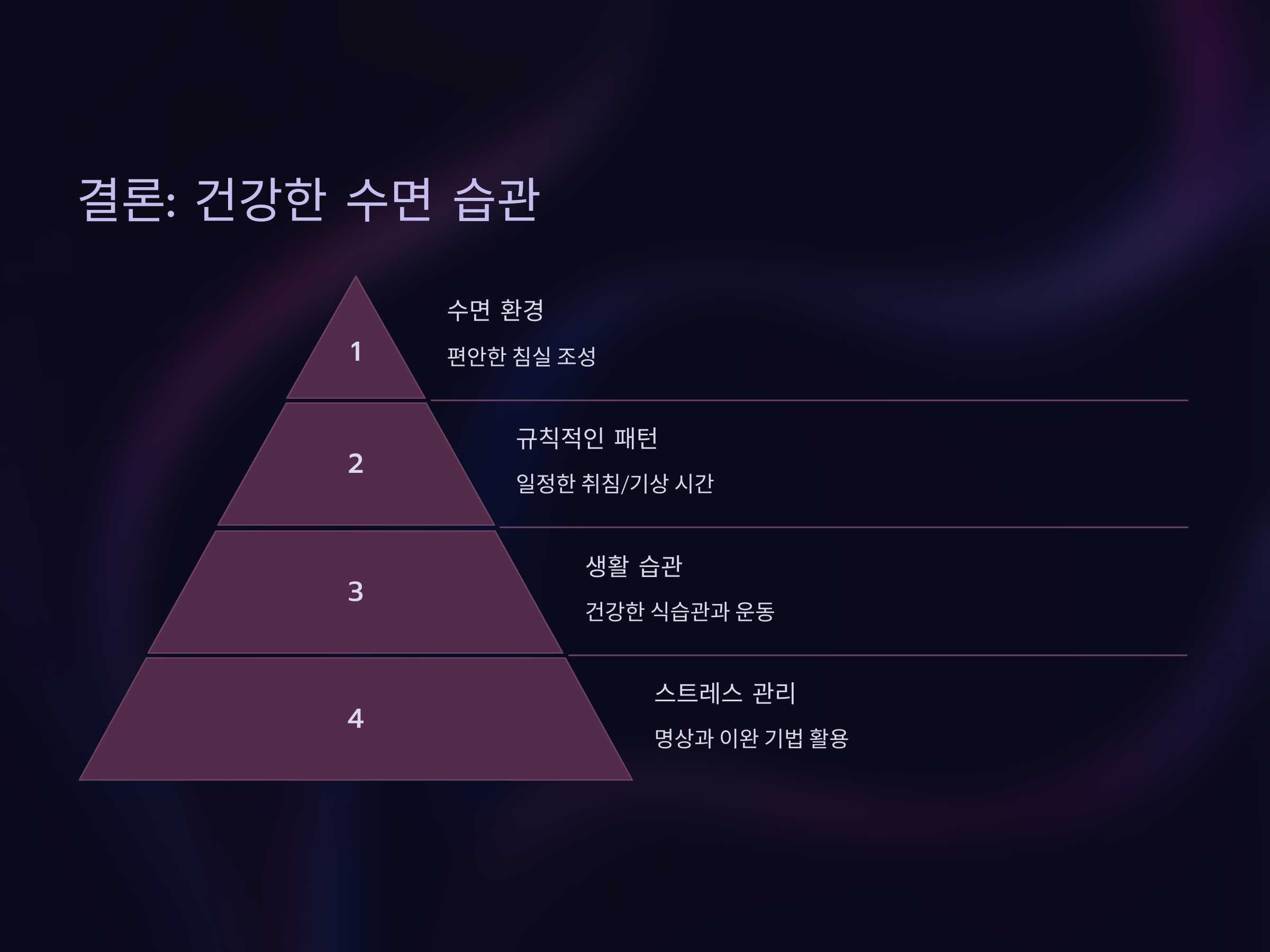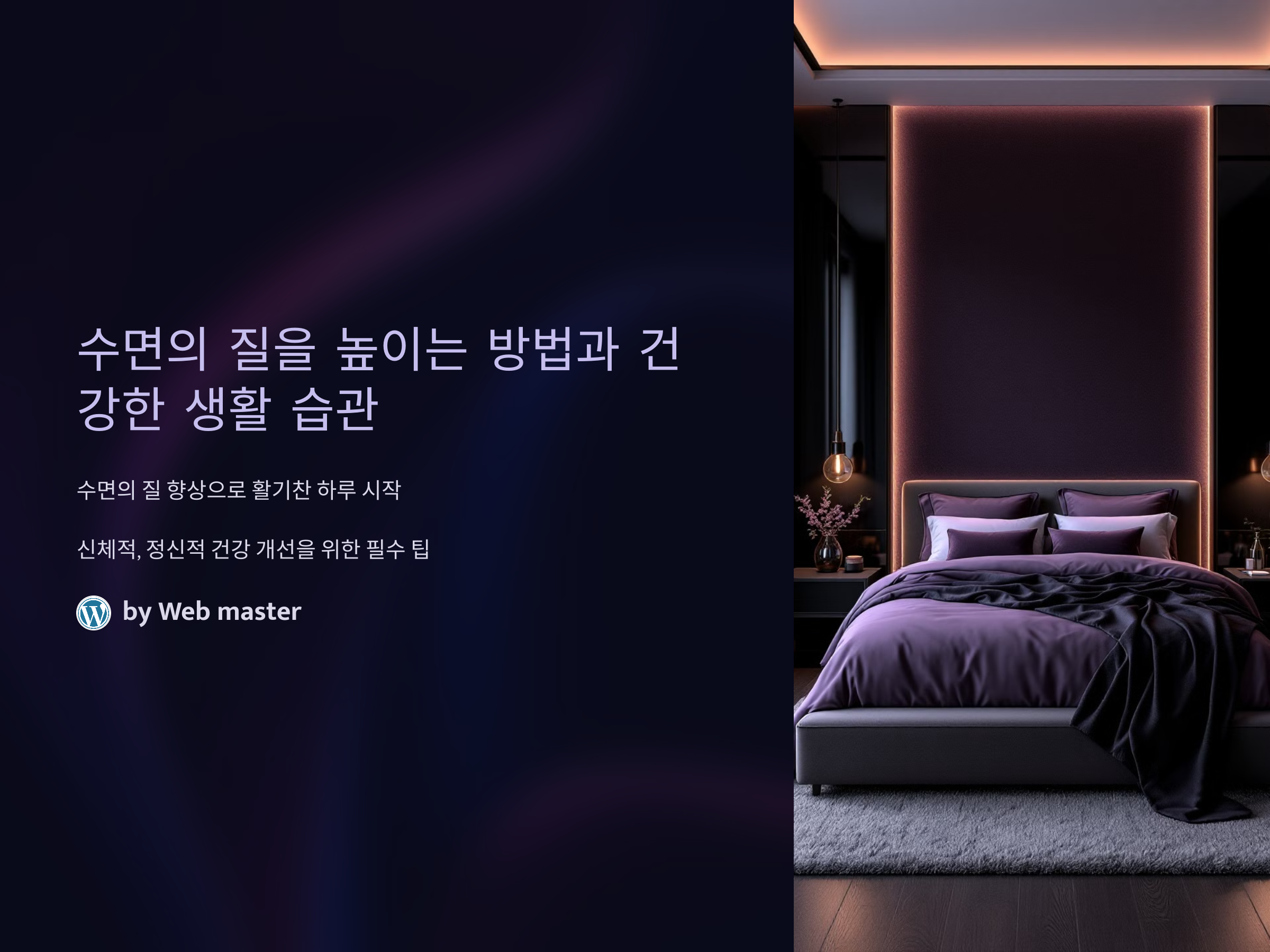수면의 질을 높이기 위해서는 일정한 수면 습관, 편안한 수면 환경, 건강한 식습관, 그리고 스트레스 관리가 모두 중요합니다. 하루의 피로를 회복하고, 정신적인 안정감을 찾기 위해서는 좋은 수면이 필수적입니다. 이 모든 습관을 꾸준히 실천하면서 더 나은 수면을 취해 보세요.