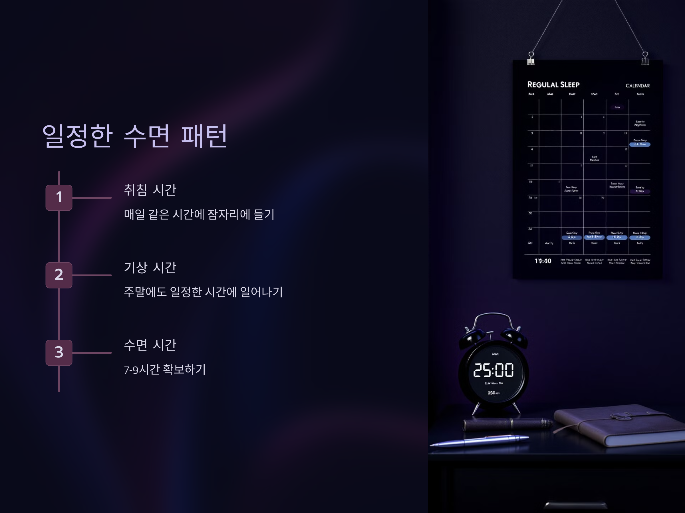 매일 일정한 시간에 잠자리에 들고, 일어나는 것이 중요합니다. 주말이라고 해서 늦잠을 자는 것보다는, 평일과 동일한 시간에 일어나도록 하세요. 규칙적인 수면 시간은 생체 시계를 안정시켜, 잠드는 시간이 자연스럽게 몸에 맞춰지게 만듭니다.