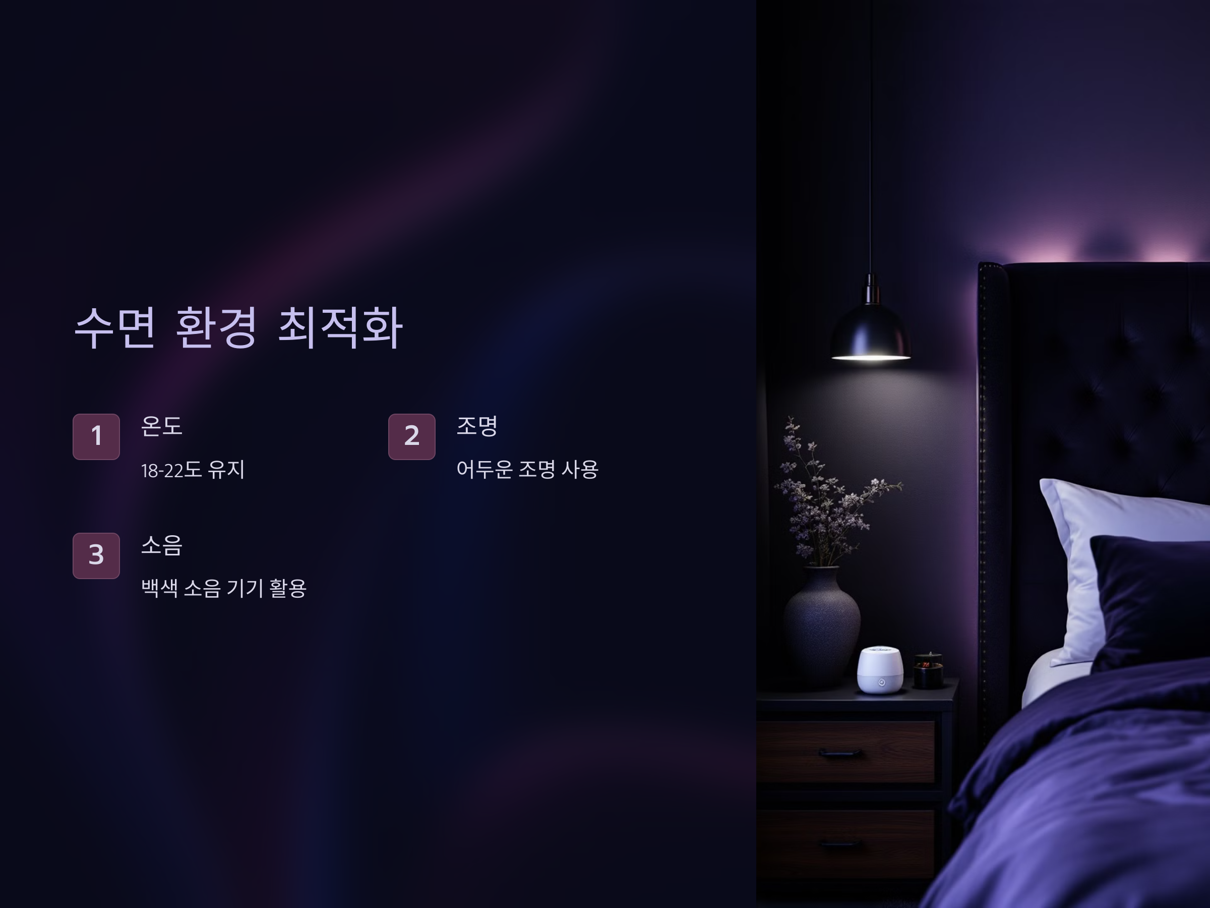 편안한 침대, 적정 온도, 어두운 환경, 소음 최소화 등 수면 환경을 조절하면 수면의 질이 개선될 수 있습니다. 침실을 조용하고, 어두운 환경으로 유지하는 것이 중요합니다.