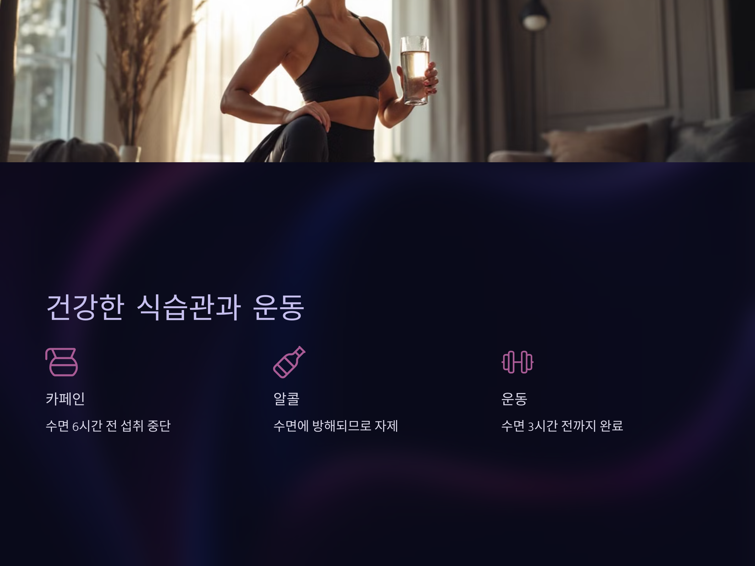 건강한 식습관과 운동은 수면의 질에 큰 영향을 미칩니다. 특정 음식이나 음료는 수면을 방해할 수 있기 때문에, 무엇을 먹고 마시는지에 대해 신경을 써야 합니다.