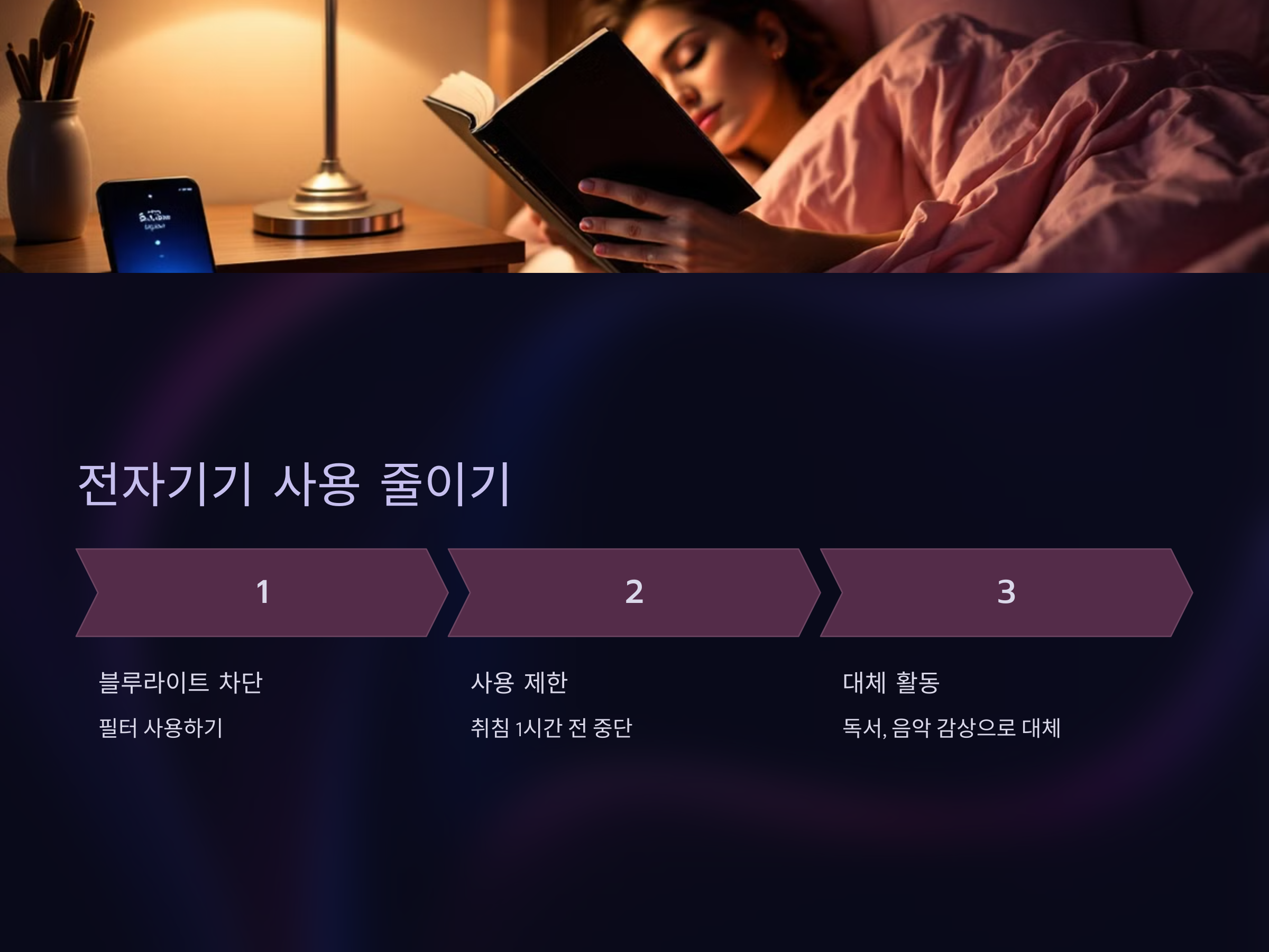 전자기기를 과도하게 사용하지 않도록 노력하세요. 특히, 잠자기 전에는 스마트폰을 사용하지 않고, 대신 책을 읽거나 명상, 음악 등을 활용하는 것이 수면에 더 도움이 됩니다.