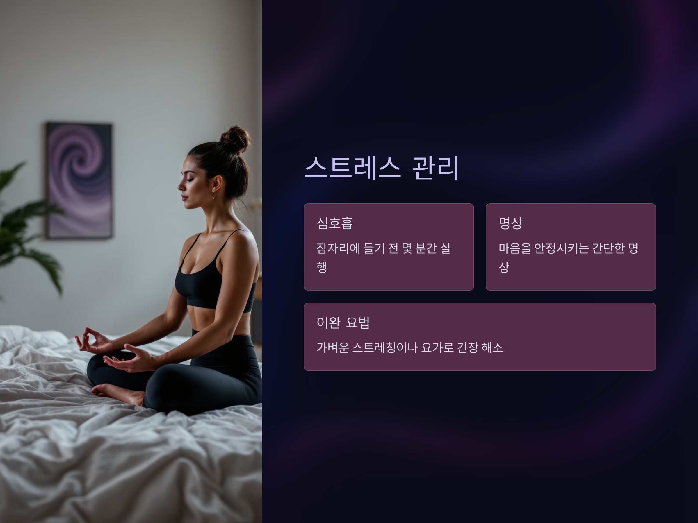 심호흡과 명상은 몸과 마음을 안정시키는 데 도움을 줍니다. 잠자리에 들기 전 몇 분 동안 깊게 호흡을 하거나, 간단한 명상으로 마음을 가라앉히세요. 이는 불안감을 줄이고, 긴장을 풀어줘 더 깊은 수면을 유도할 수 있습니다.