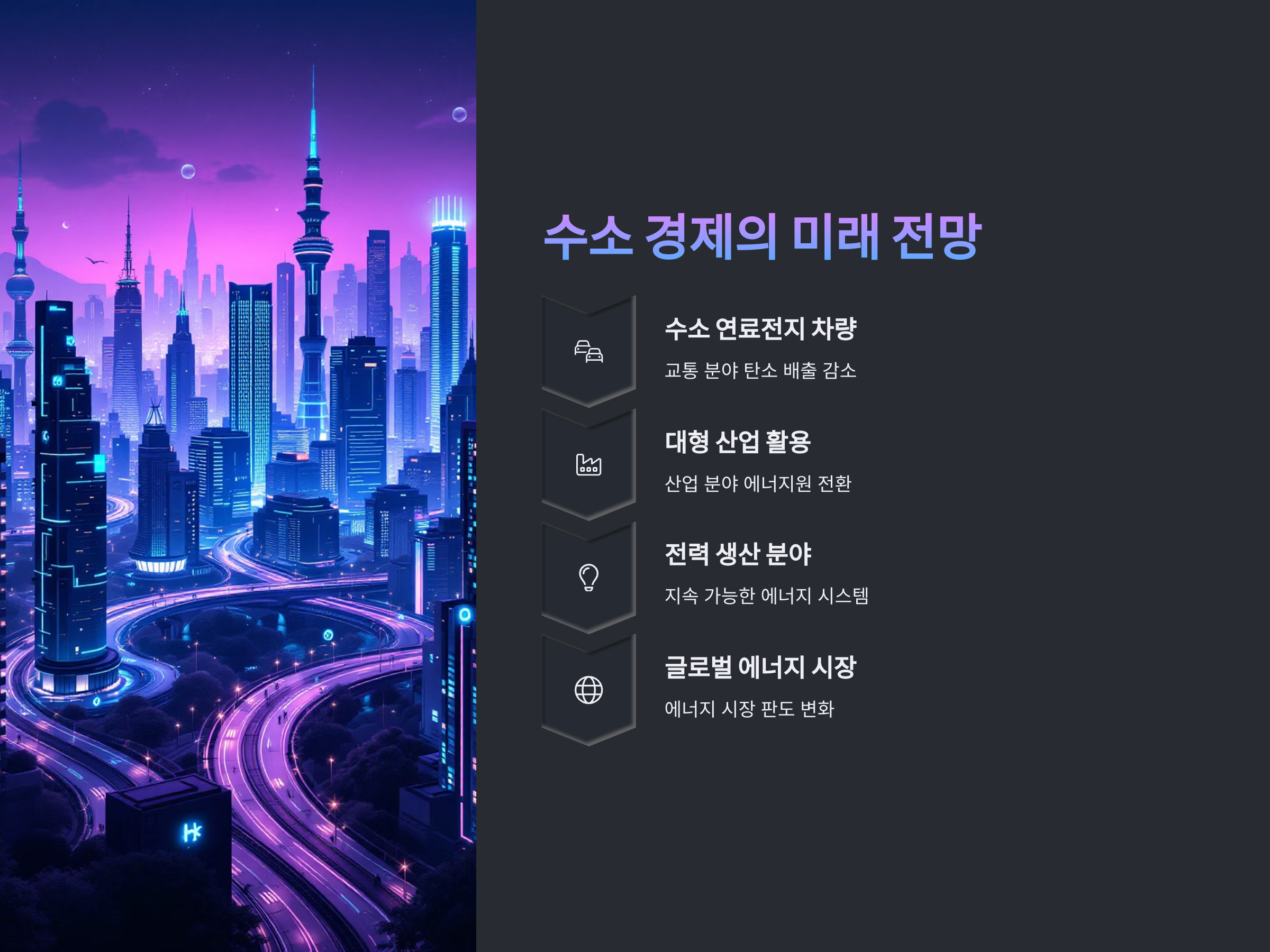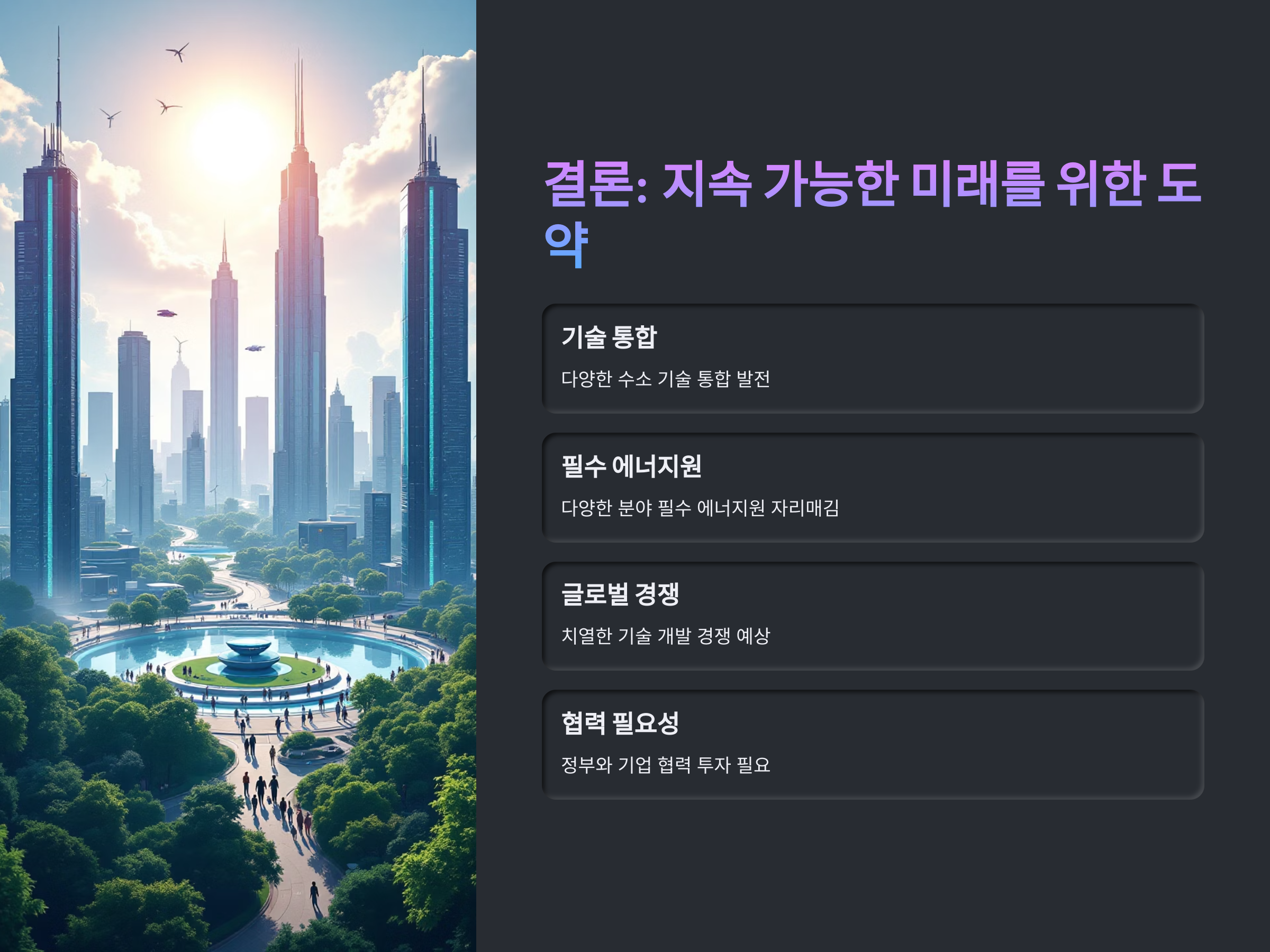 수소 경제는 단기적인 목표를 넘어 장기적으로 지속 가능한 에너지 시스템으로 자리 잡을 것입니다. 다양한 기술들이 통합되고 발전하면서 수소는 많은 분야에서 필수적인 에너지원으로 자리 잡게 될 것입니다. 수소 연료전지 차량, 대형 산업, 그리고 전력 생산 분야에서의 활용 가능성은 무궁무진하며, 수소 기술 개발이 성공적으로 이루어진다면, 이는 글로벌 에너지 시장의 판도를 바꿀 것입니다.