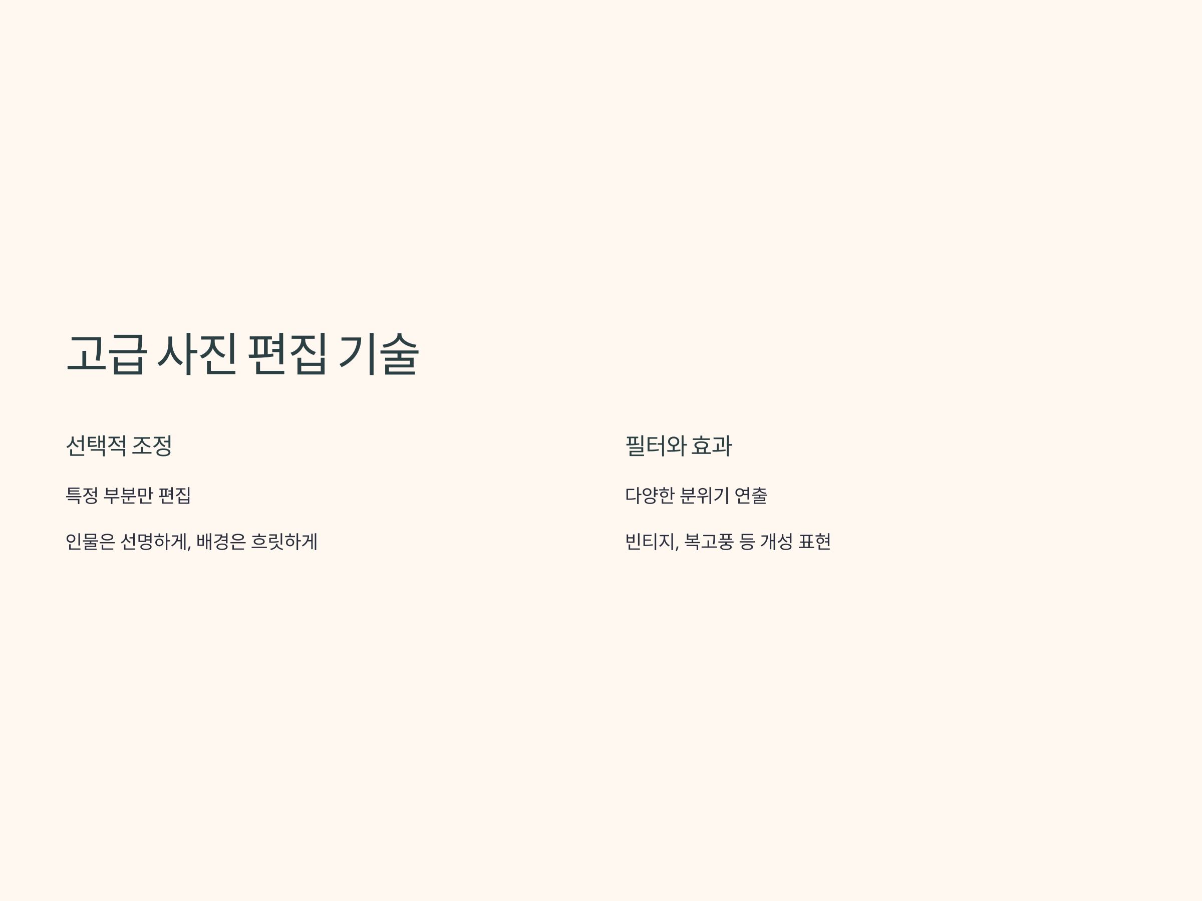 사진의 특정 부분만 조정하고 싶을 때는 '선택적 조정' 기능을 사용하면 좋습니다. 이 기능을 활용하면 배경은 그대로 두고, 인물이나 중요한 요소만 밝기나 색감을 조정할 수 있습니다. 예를 들어, 인물의 얼굴만 선명하게 강조하고, 배경은 흐릿하게 만들어 사진을 더욱 돋보이게 만들 수 있습니다.