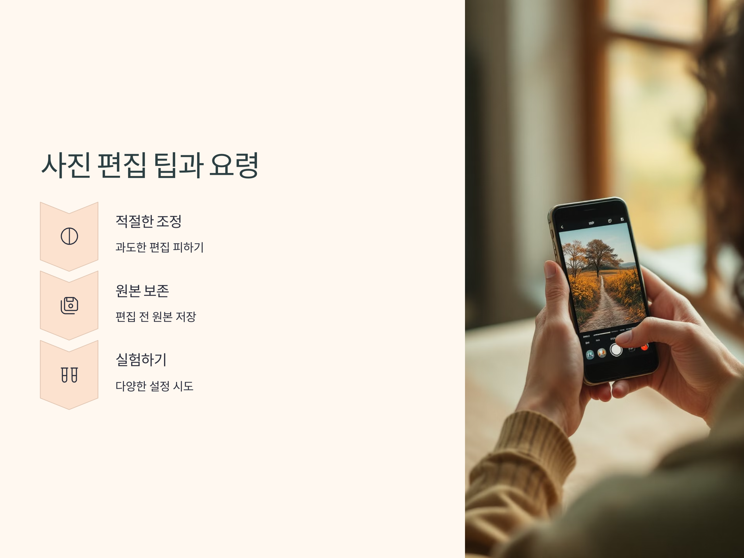 사진을 편집할 때에는 몇 가지 중요한 팁을 기억하면 편집이 더욱 쉬워집니다. 특히, 편집 과정에서 너무 과도한 조정을 피하고 자연스러운 결과를 추구하는 것이 중요합니다.