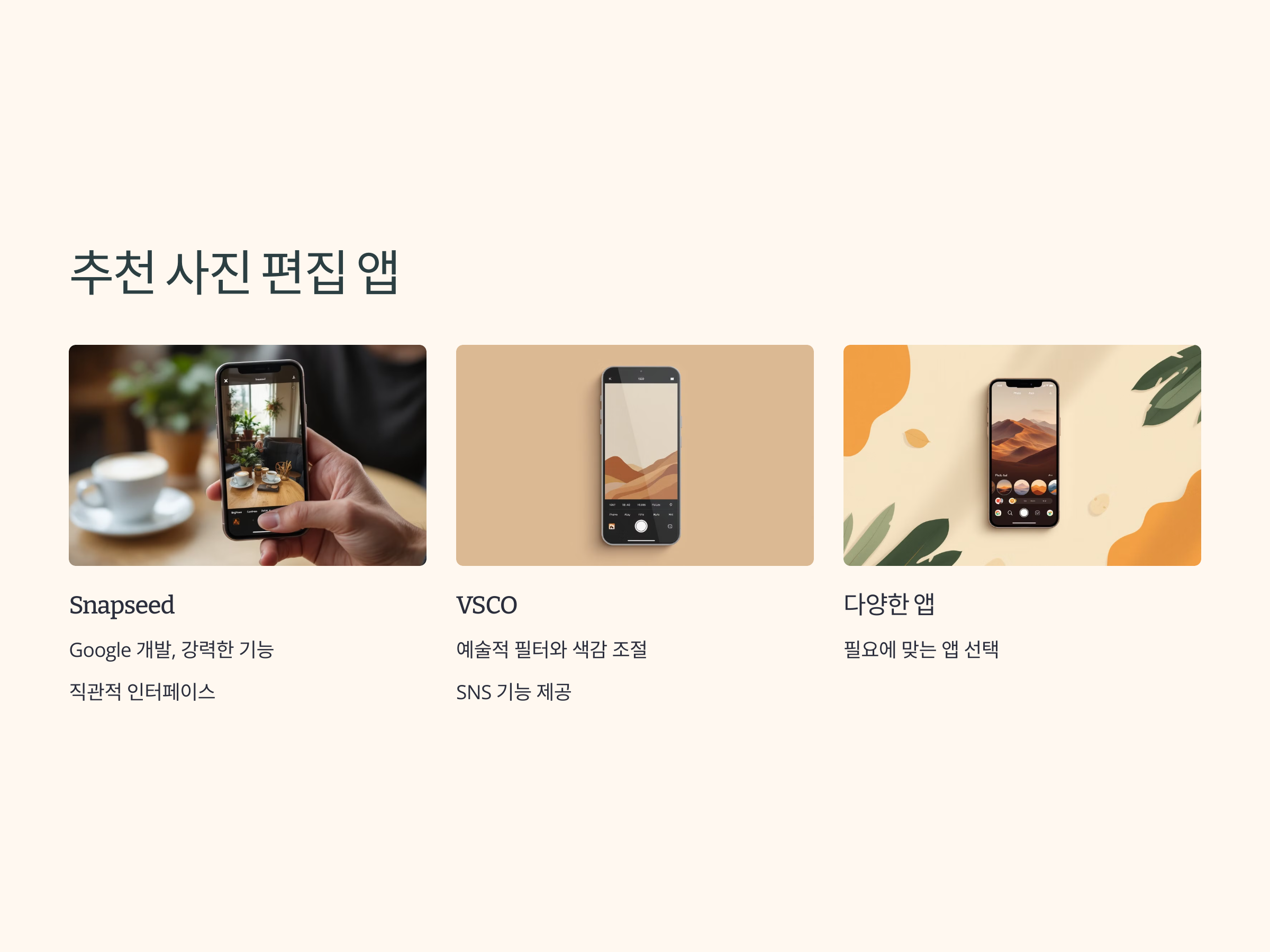 스마트폰에서 사용할 수 있는 다양한 사진 편집 앱들이 있습니다. 이들 앱은 각기 다른 기능과 스타일을 제공하므로, 사용자의 필요에 맞게 선택하면 됩니다. 아래는 사용자들 사이에서 인기가 많은 사진 편집 앱들을 소개합니다.