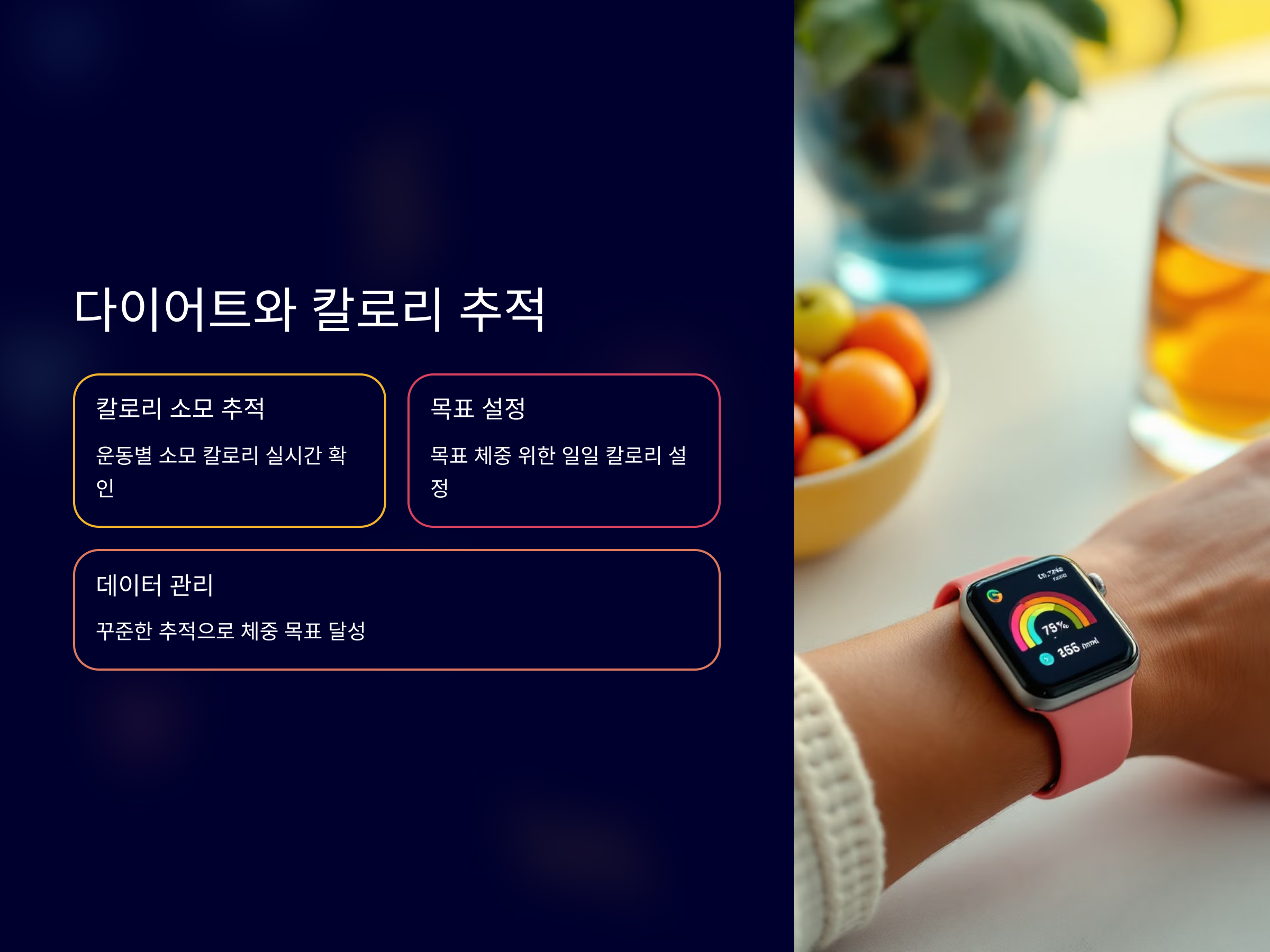 다이어트 중에는 일정한 칼로리 섭취와 소모가 필요합니다. 스마트워치를 사용하면 이를 실시간으로 체크하면서 과식을 방지하고, 운동량에 맞춰 적절한 칼로리 소모를 할 수 있습니다. 또한, 일부 스마트워치에서는 사용자에게 식단에 대한 피드백을 제공하기도 하며, 건강한 식단을 유지하는 데 도움을 줍니다.