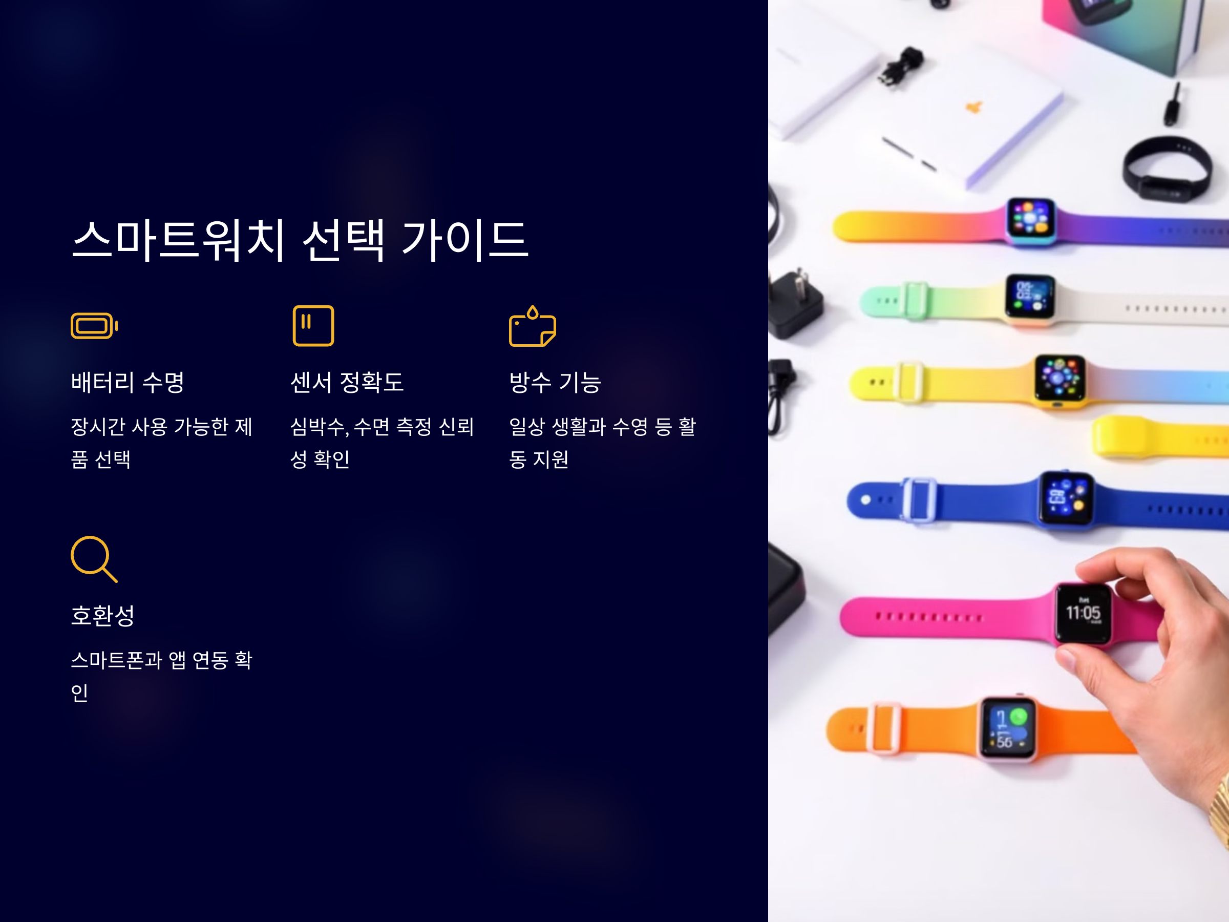 스마트워치는 이제 단순한 시계 기능을 넘어, 건강을 관리하는 중요한 도구로 자리잡았습니다. 운동, 심박수, 수면, 스트레스 관리, 다이어트 등 다양한 건강 지표를 손목에서 간편하게 관리할 수 있는 스마트워치는 건강한 삶을 위한 스마트한 선택입니다.
