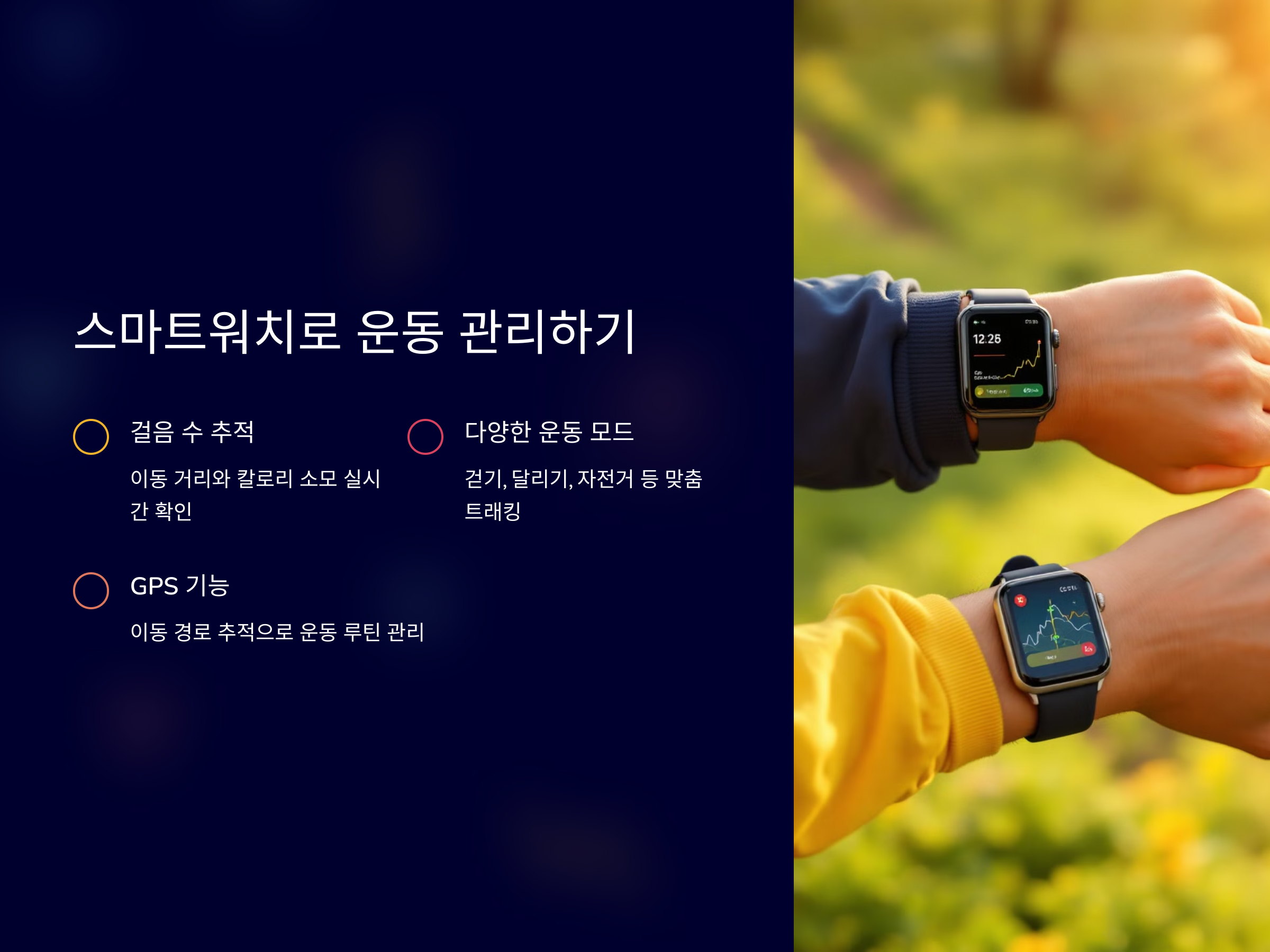 스마트워치를 활용한 운동 관리는 매우 직관적이고 간단합니다. 스마트워치에는 기본적으로 걸음 수, 칼로리 소모, 이동 거리 등 다양한 운동 데이터를 실시간으로 추적할 수 있는 기능이 탑재되어 있습니다. 특히 운동 목표를 설정하고 이를 달성하기 위한 피드백을 받을 수 있어 동기 부여가 강해집니다.