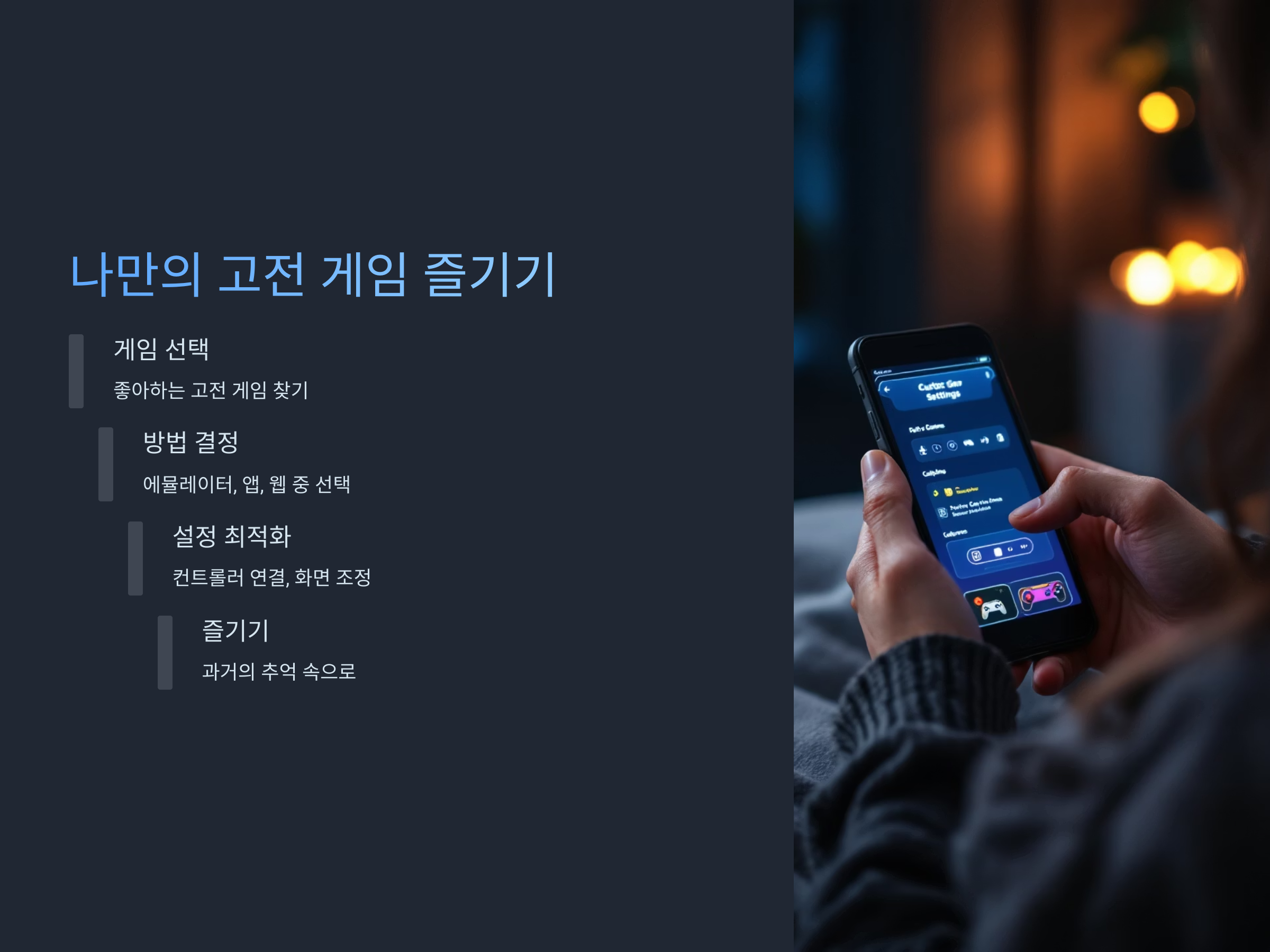 스마트폰에서 고전 게임을 즐기는 방법은 생각보다 간단합니다. 여러 가지 방법으로 고전 게임을 플레이할 수 있으며, 여기서는 그 중 가장 효과적이고 인기 있는 방법을 소개합니다. 지금부터 고전 게임을 스마트폰에서 즐기기 위한 방법들을 살펴보겠습니다. 또한, 최신 게임과 고전 게임의 차이점과, 게임을 어떻게 설정하는지에 대해서도 다룰 것입니다.