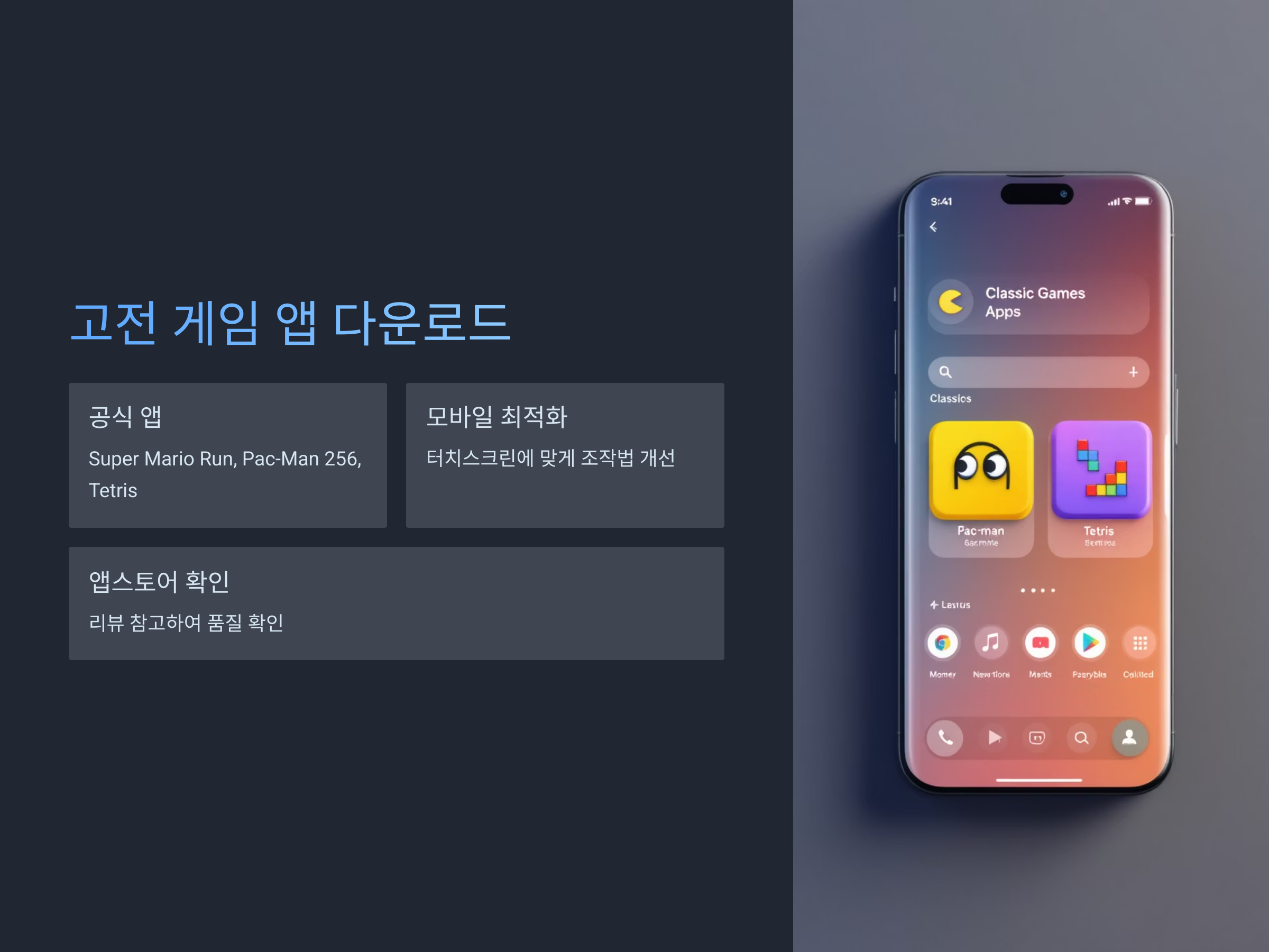 에뮬레이터 대신, 고전 게임 자체가 앱 형태로 제공되는 경우도 많습니다. 'Super Mario Run', 'Pac-Man 256', 'Tetris®'와 같은 게임들은 스마트폰에 최적화되어 그대로 즐길 수 있습니다. 이들 게임은 과거의 그래픽과 스토리를 유지하면서도 모바일 화면에 맞게 조작 방법을 바꾸고, 편리하게 즐길 수 있도록 만들어졌습니다.