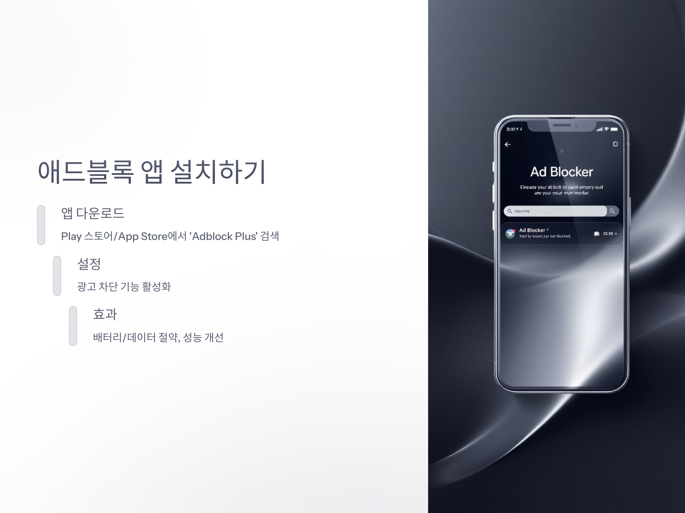 애드블록(Adblock)은 광고를 차단하는 가장 기본적인 방법 중 하나입니다. 안드로이드와 iOS에서 모두 사용할 수 있는 앱으로, 스마트폰의 웹 브라우저에서 나타나는 광고를 자동으로 차단해 줍니다. 애드블록을 설치하면 웹사이트의 광고가 더 이상 표시되지 않아 더 빠르고 깨끗한 인터넷 환경을 경험할 수 있습니다.