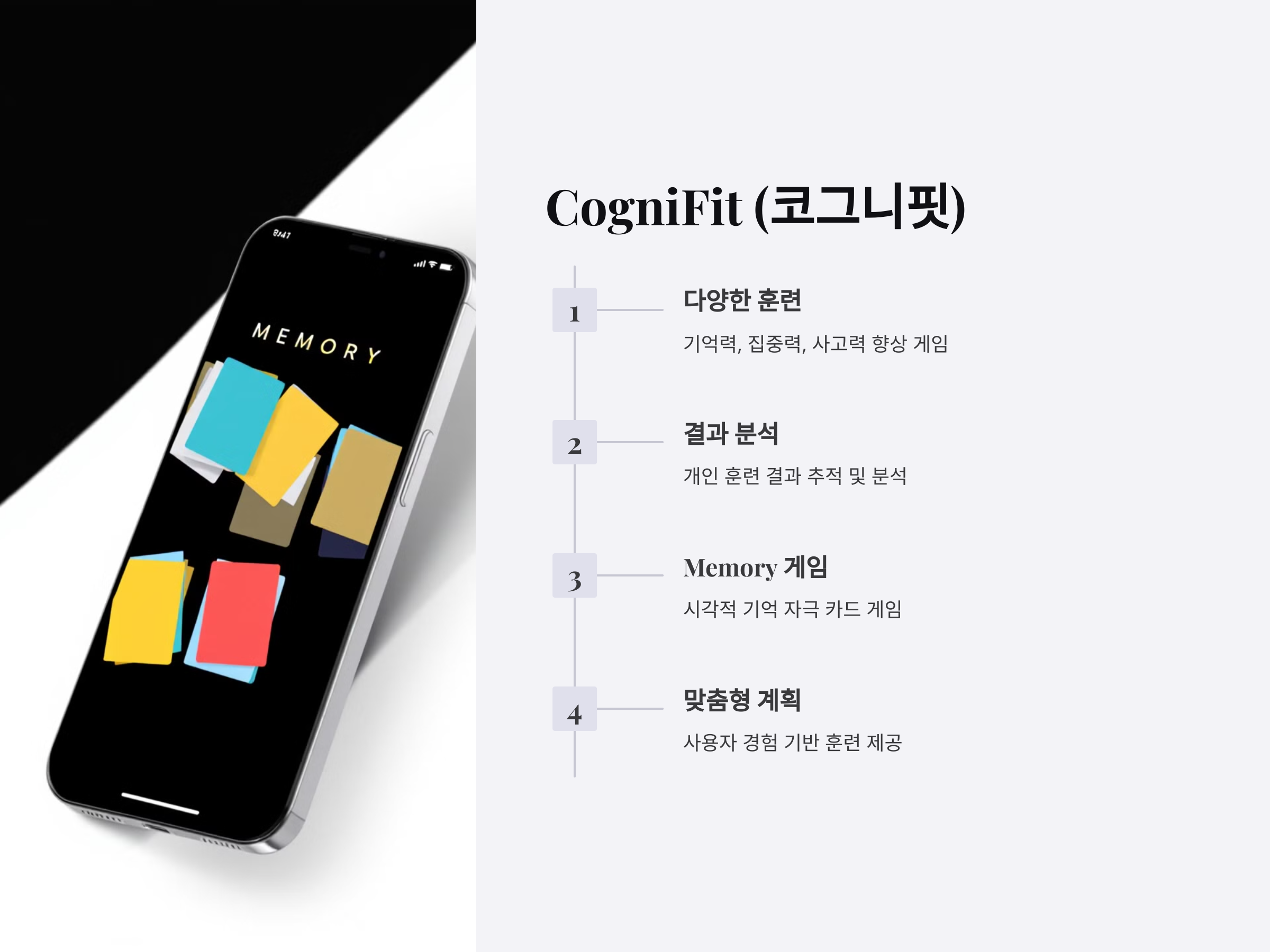 CogniFit은 다양한 두뇌 훈련 프로그램을 제공하는 앱으로, 뇌의 다양한 영역을 자극하는 게임을 제공하여 기억력뿐만 아니라 집중력, 사고력 등을 향상시킬 수 있습니다. 이 앱은 사용자가 자신의 훈련 결과를 분석할 수 있는 기능을 제공하며, 훈련 계획을 개인화하여 진행할 수 있도록 돕습니다.