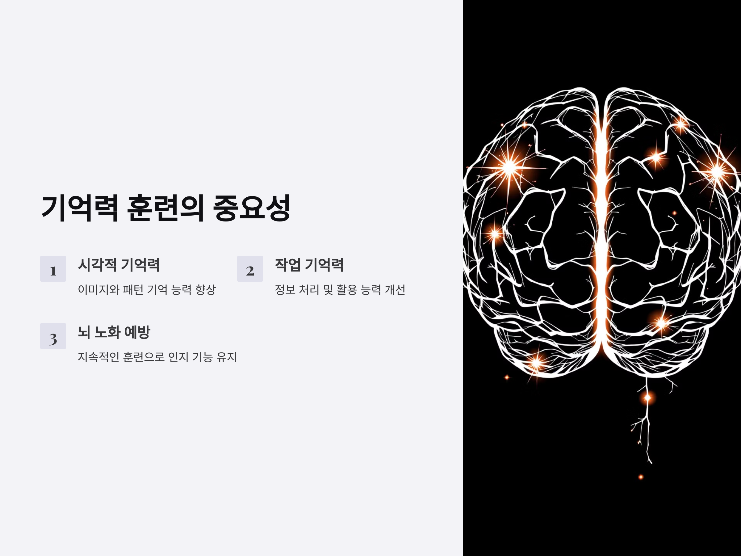 기억력 훈련 게임은 기본적으로 두 가지 요소를 제공합니다. 첫째, 시각적 기억력 훈련, 둘째, 작업 기억력 훈련입니다. 이를 통해 당신의 두뇌는 더 빠르고, 정확하게 반응하며, 일상적인 활동을 더 효과적으로 처리할 수 있게 됩니다. 이 게임들은 단순히 재미있을 뿐만 아니라, 뇌의 노화를 예방하는 데에도 큰 도움이 될 수 있습니다.