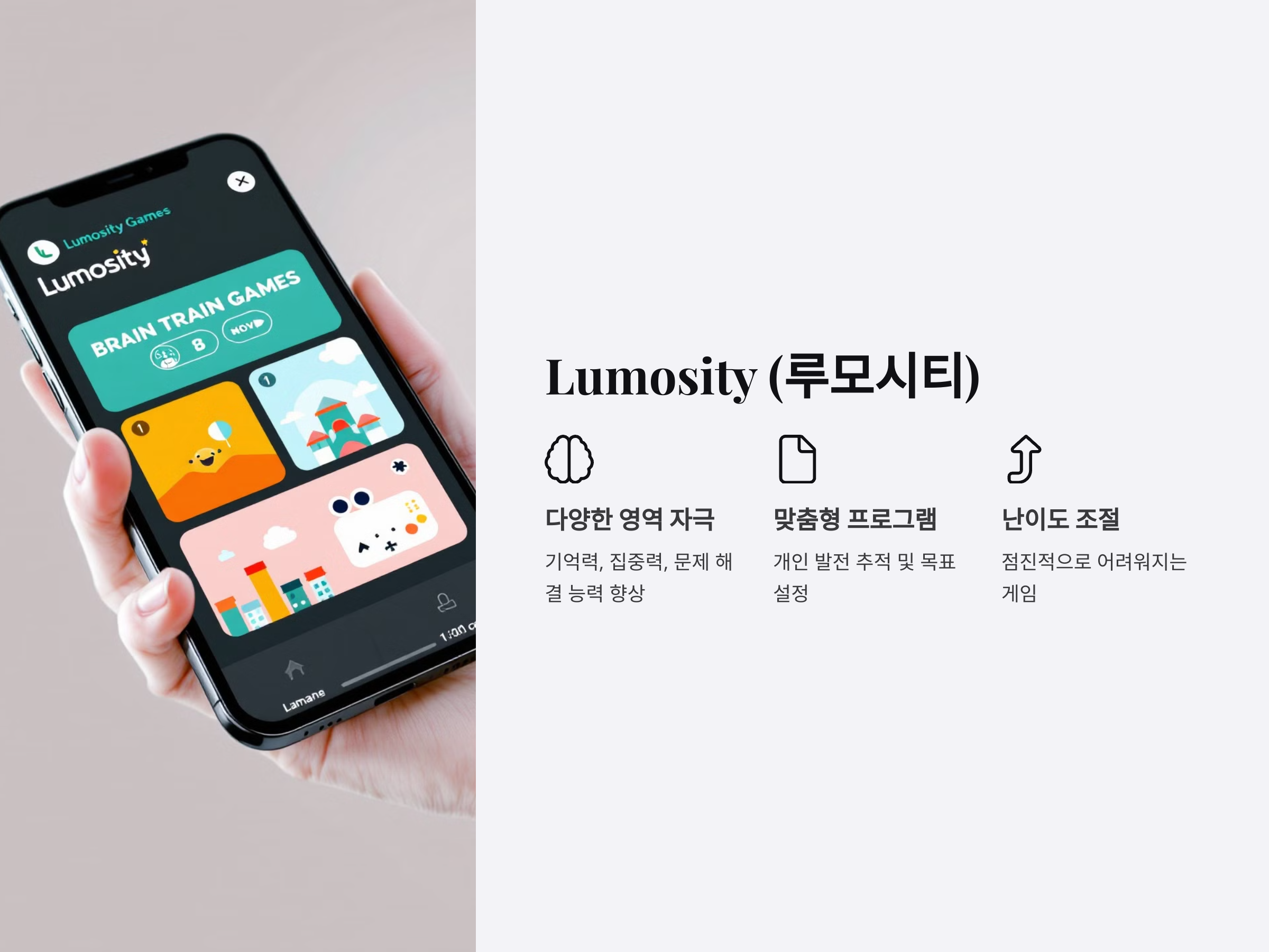 Lumosity는 두뇌 훈련 게임으로 잘 알려져 있으며, 다양한 영역의 뇌를 자극하는 게임을 제공합니다. 이 앱은 기억력, 집중력, 문제 해결 능력 등을 향상시킬 수 있는 다양한 미니 게임을 제공합니다. 특히 개인 맞춤형 훈련 프로그램을 제공하여, 사용자가 자신의 발전 상황을 추적하고 목표를 설정할 수 있도록 돕습니다.