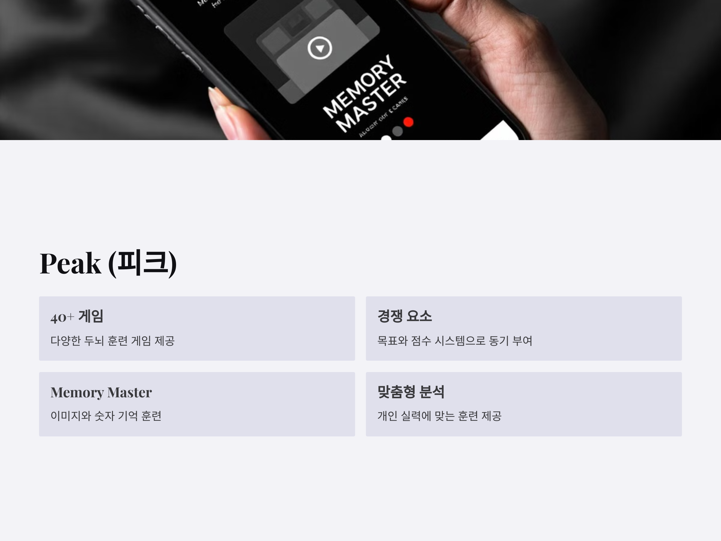 Peak은 Lumosity와 비슷한 방식으로 두뇌 훈련을 제공합니다. 이 앱은 40개 이상의 다양한 게임을 제공하며, 그 중에서도 기억력과 집중력을 향상시킬 수 있는 게임들이 포함되어 있습니다. 특히 각 게임마다 목표와 점수 시스템이 있어, 자극적인 경쟁 요소를 제공합니다. "Memory Master"라는 게임은 특히 기억력을 자극하는 데 탁월한 게임으로, 다양한 이미지와 숫자를 기억하는 훈련을 통해 뇌의 기억력을 증진시킬 수 있습니다.