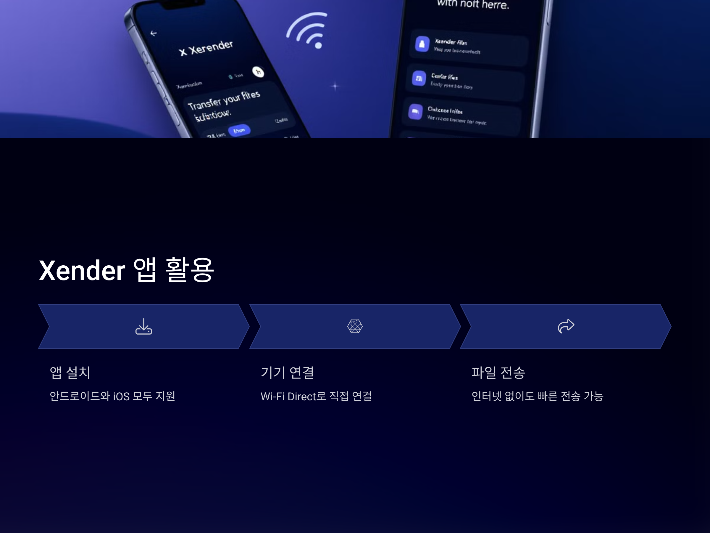 Xender는 안드로이드와 iOS 모두에서 사용할 수 있는 파일 전송 앱입니다. Xender는 Wi-Fi Direct 기술을 활용하여 빠르게 파일을 전송할 수 있으며, 데이터 요금이 발생하지 않고, 인터넷 없이도 파일을 쉽게 공유할 수 있습니다. Xender는 대용량 파일 전송에 적합하고, 여러 파일을 동시에 공유할 수 있는 장점이 있습니다.