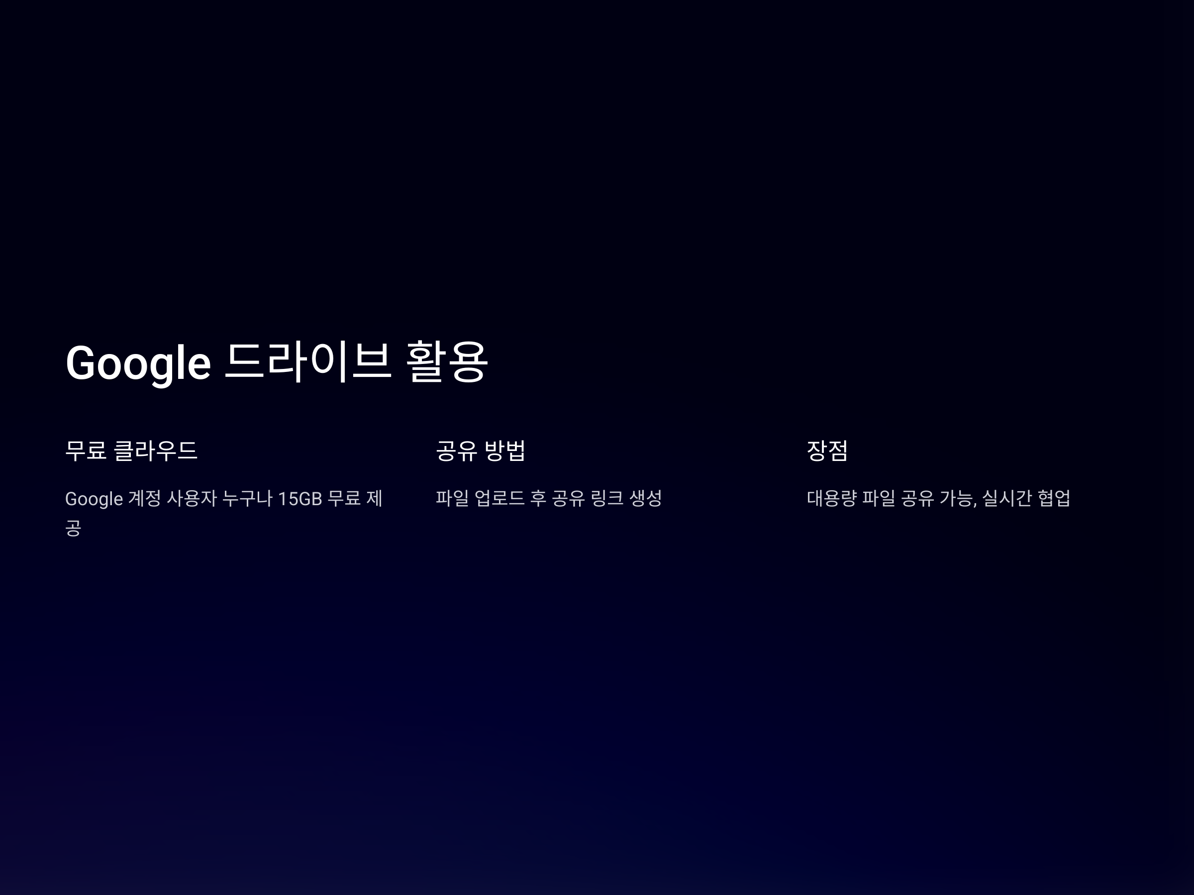 Google 드라이브의 가장 큰 장점은 대용량 파일도 손쉽게 공유할 수 있다는 점입니다. 기본적으로 15GB까지 무료로 제공되며, 사진, 동영상, 문서 등 다양한 형식의 파일을 저장하고 공유할 수 있습니다. 또한, 드라이브 내에서 파일을 실시간으로 편집하거나 다른 사람과 협업하는 것도 가능합니다.