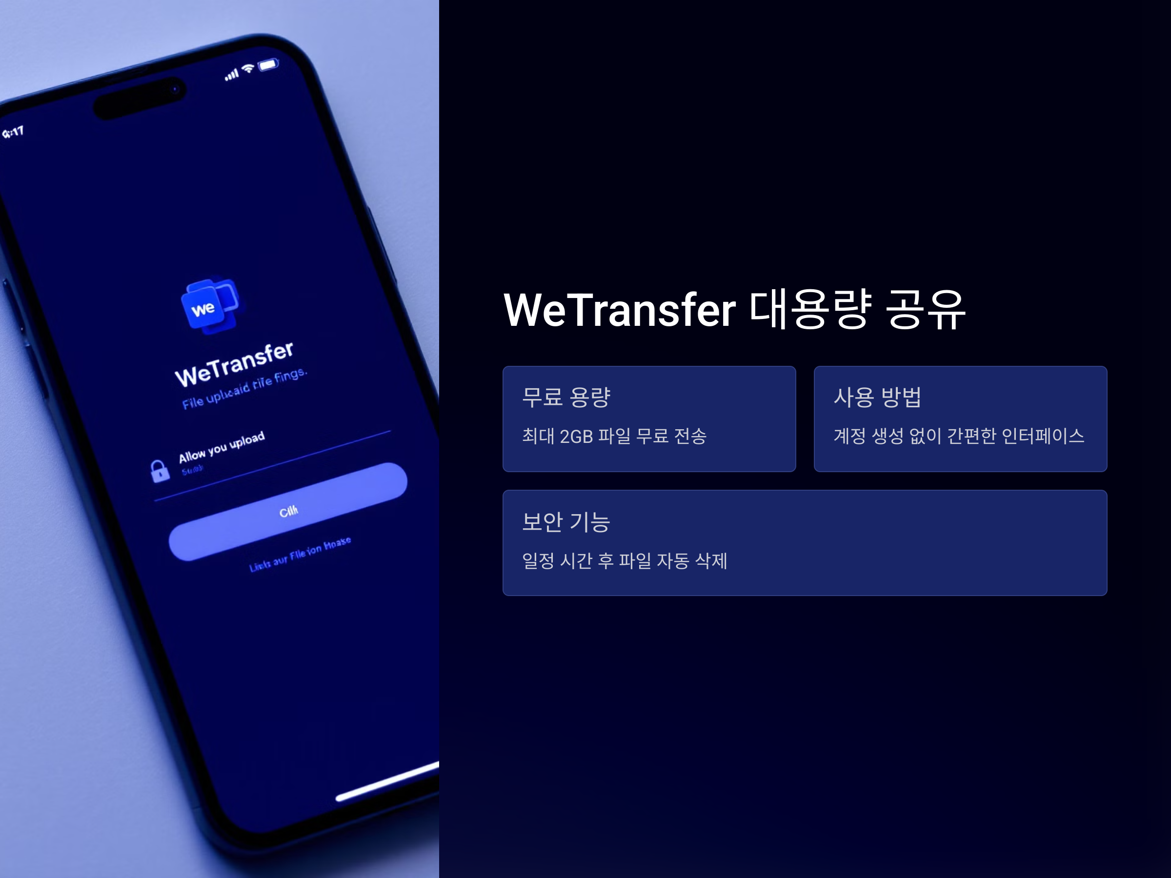 WeTransfer는 대용량 파일을 빠르게 공유할 수 있는 온라인 서비스입니다. 최대 2GB의 파일을 무료로 전송할 수 있으며, 매우 간편한 사용자 인터페이스를 제공합니다. 파일을 업로드한 후 공유 링크를 생성하고, 그 링크를 다른 사람에게 전달하면 쉽게 파일을 전송할 수 있습니다.