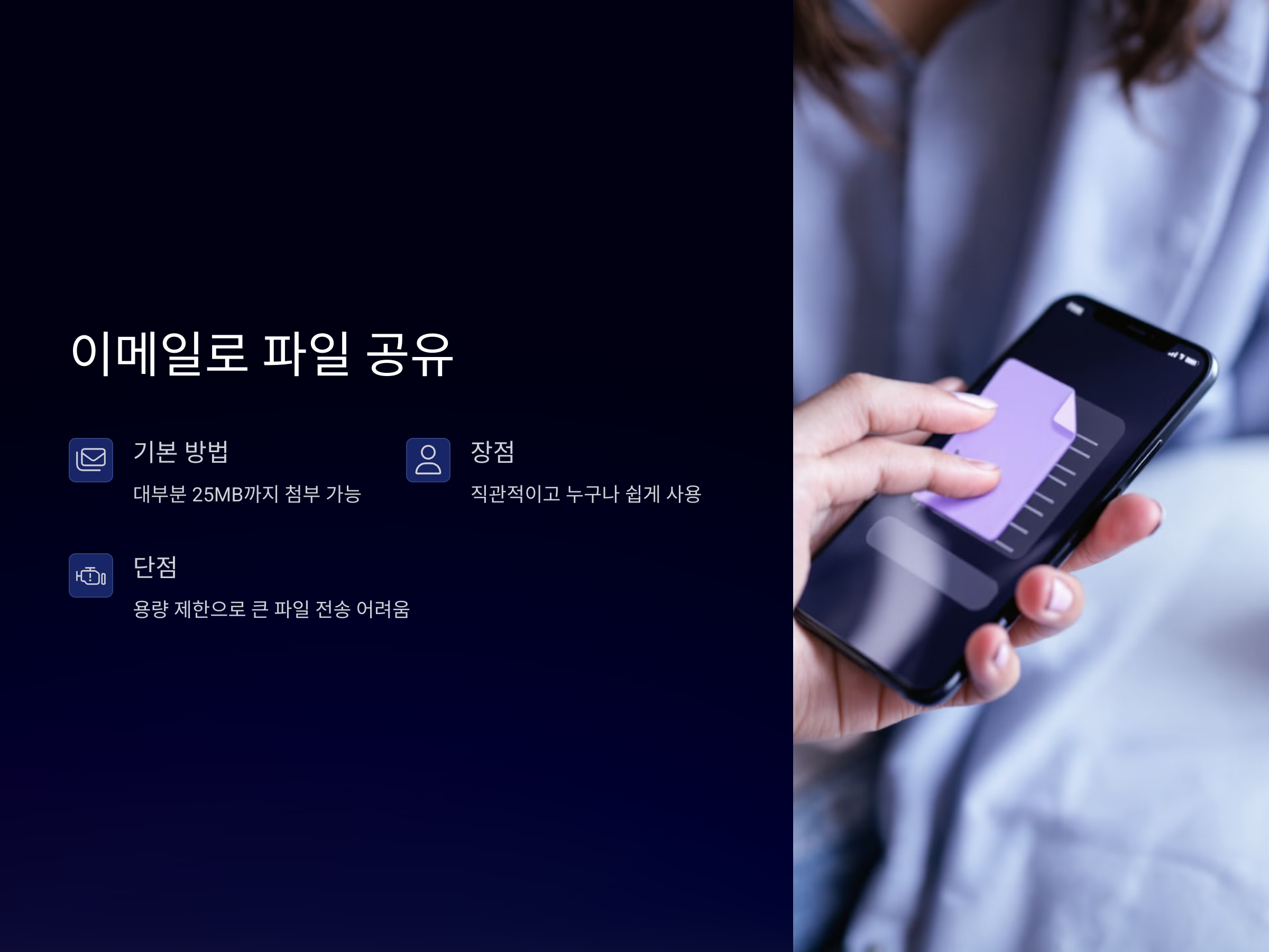 이메일을 이용한 파일 공유는 스마트폰에서 가장 기본적인 방법 중 하나입니다. 이메일을 통해 파일을 첨부하고 다른 사람에게 쉽게 전달할 수 있습니다. Gmail, Outlook, 네이버 메일 등 대부분의 이메일 서비스는 기본적으로 25MB까지 파일을 첨부할 수 있습니다. 만약 파일 크기가 더 크다면, Google 드라이브나 OneDrive와 같은 클라우드 스토리지를 활용해 이메일로 파일을 공유할 수 있습니다.