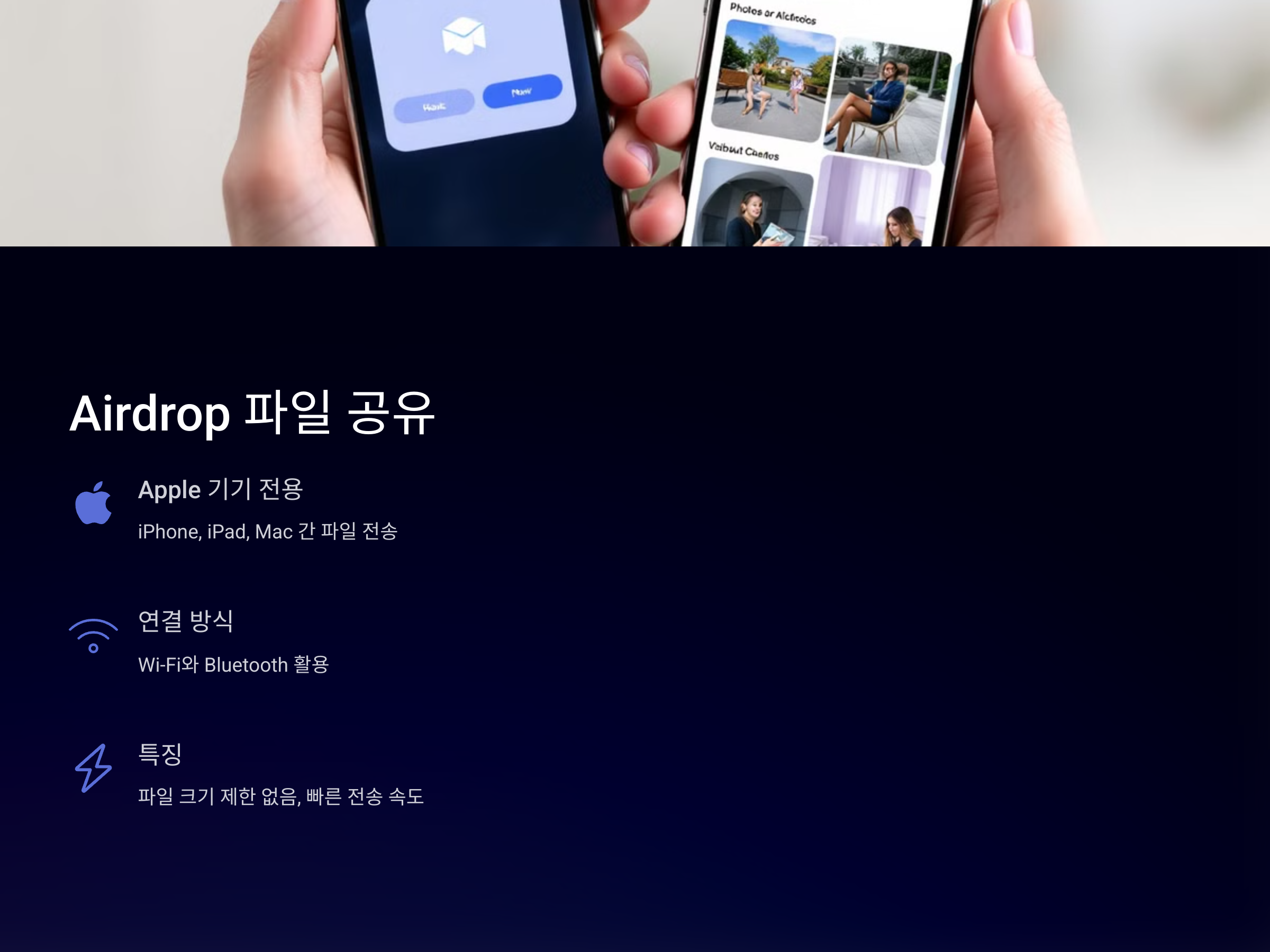 Airdrop은 특별한 설정이 필요 없고, 전송 속도가 매우 빠르며, 파일을 보내는 상대가 가까이 있을 경우 매우 유용합니다. 다만, 이 기능은 Apple 기기끼리만 사용할 수 있으므로, iPhone이나 Mac을 사용하지 않는 사람과는 사용할 수 없습니다.