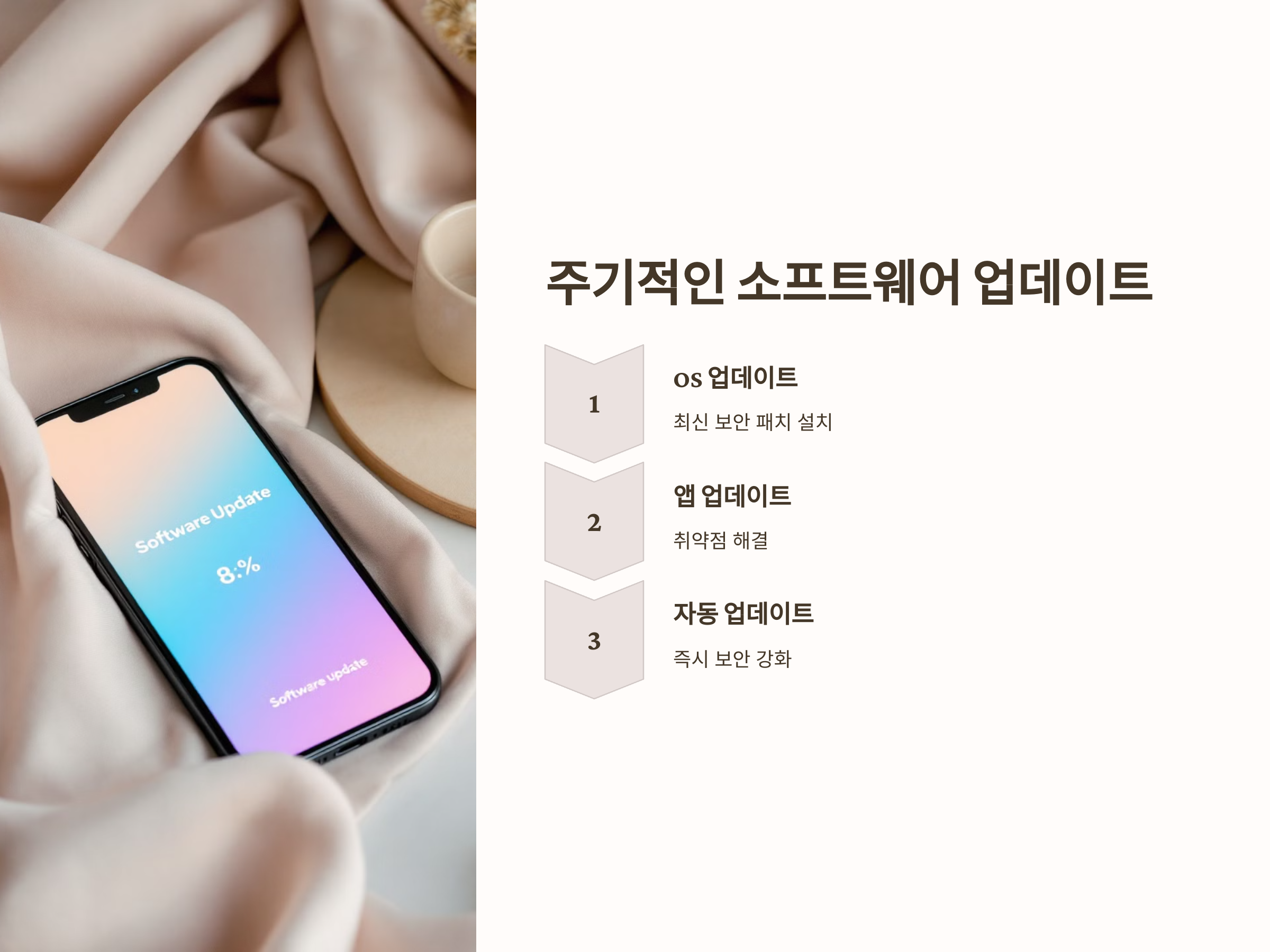 소프트웨어 업데이트는 스마트폰을 안전하게 유지하는 중요한 방법입니다. 최신 보안 패치를 설치하면, 이전에 발견된 취약점을 막을 수 있습니다. 스마트폰의 운영 체제(OS)나 앱의 최신 버전을 유지하는 것이 바이러스 감염을 방지하는 중요한 방법입니다.