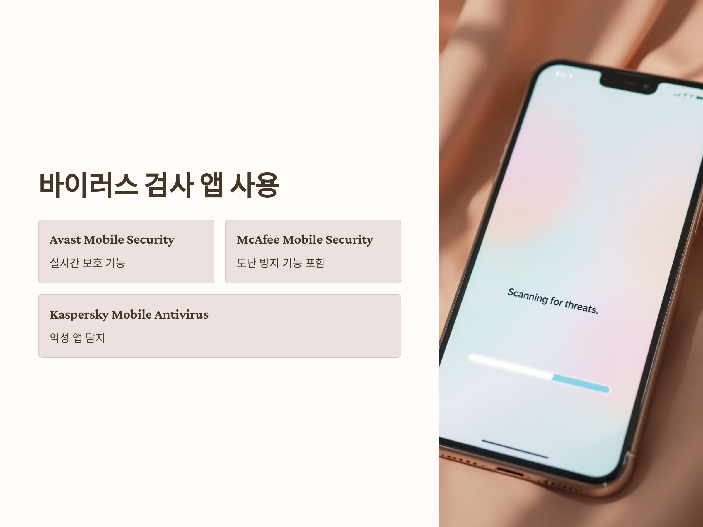 - Kaspersky Mobile Antivirus: 악성 앱 탐지 및 개인정보 보호 기능 제공