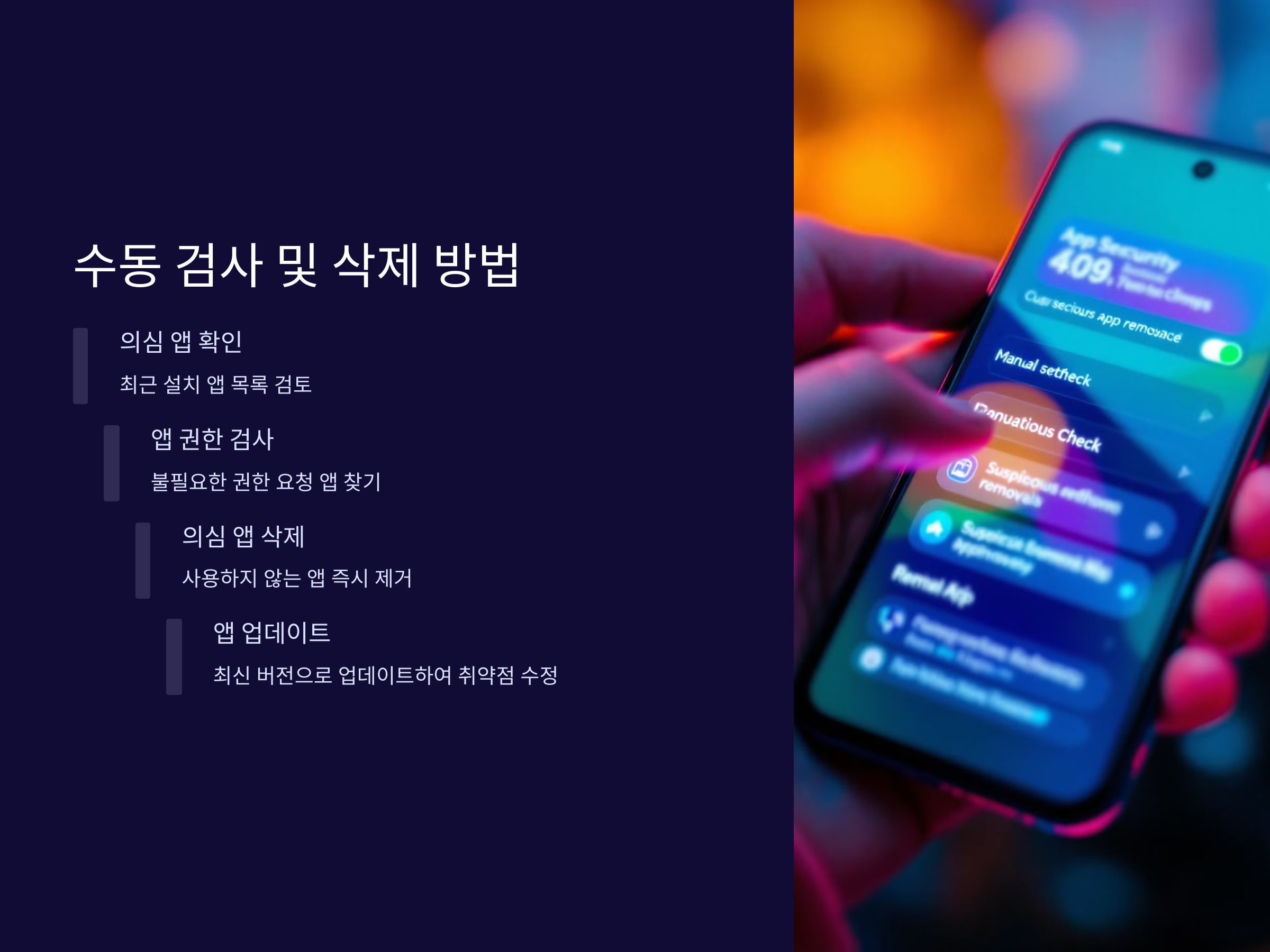 보안 앱을 사용하지 않고 수동으로 바이러스나 악성 코드를 제거하려면, 최근에 설치한 앱을 확인하고 의심되는 앱을 삭제하는 방법을 사용할 수 있습니다. 앱 관리 기능을 통해 설치된 앱 목록을 살펴보세요.