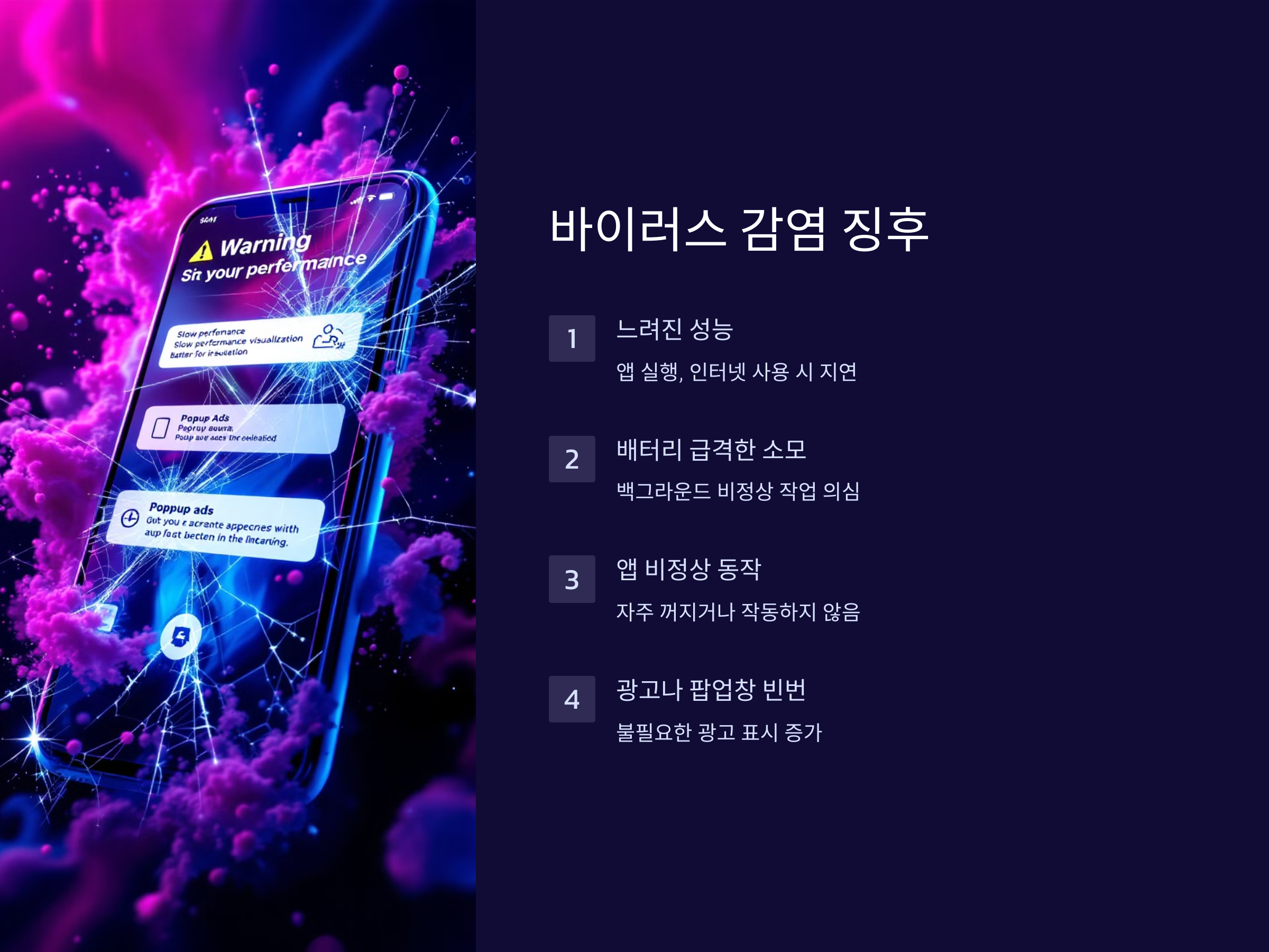 스마트폰에 바이러스나 악성 코드가 감염되었는지 확인하는 첫 번째 단계는 기기의 성능 변화나 비정상적인 행동을 살펴보는 것입니다. 바이러스 감염이 의심되는 징후는 다음과 같습니다: