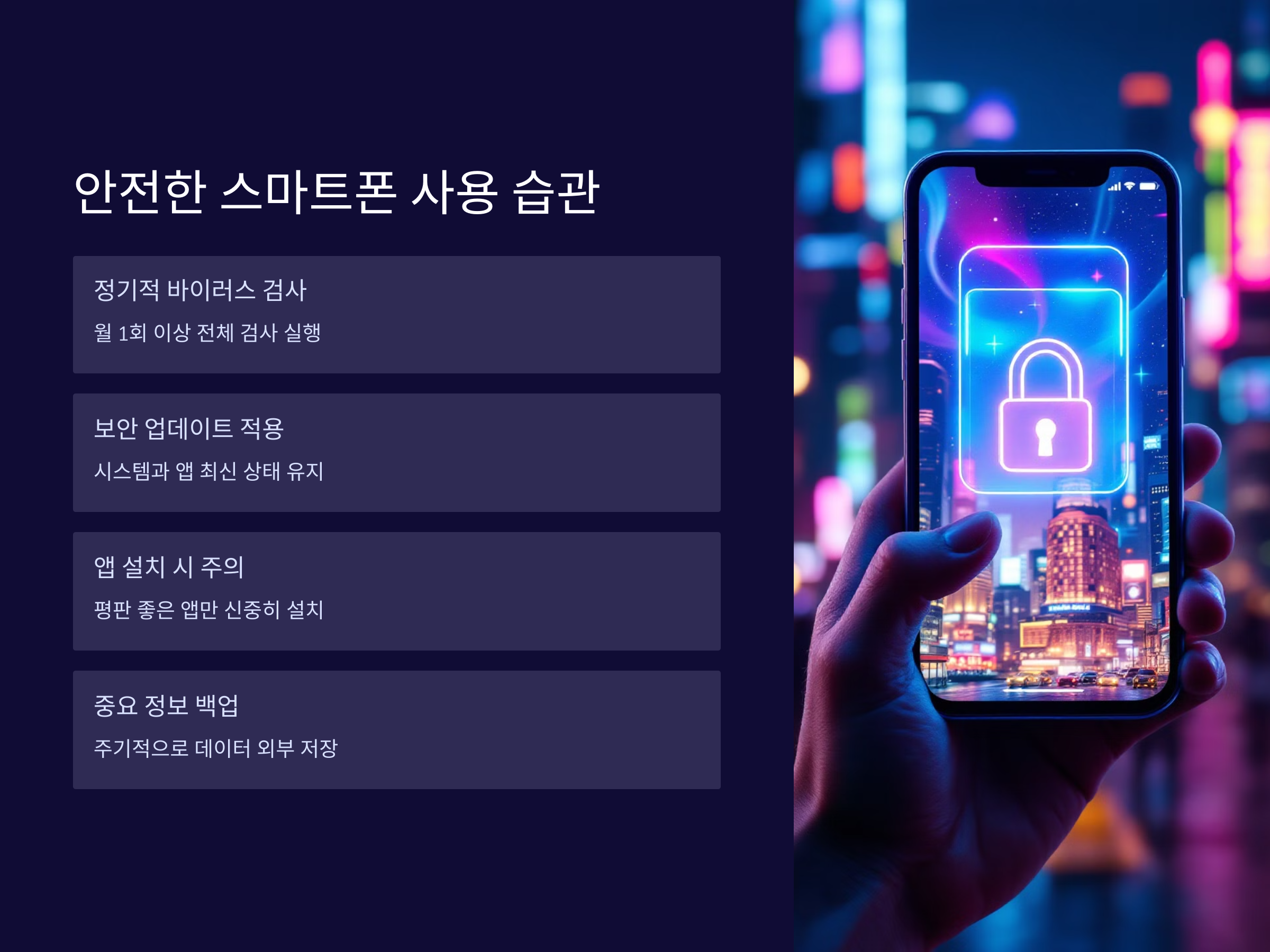 스마트폰을 안전하게 사용하는 습관을 들이면, 해킹과 바이러스로부터 보호될 수 있습니다. 이를 통해 기기 성능을 유지하고, 중요한 데이터를 안전하게 지킬 수 있습니다.