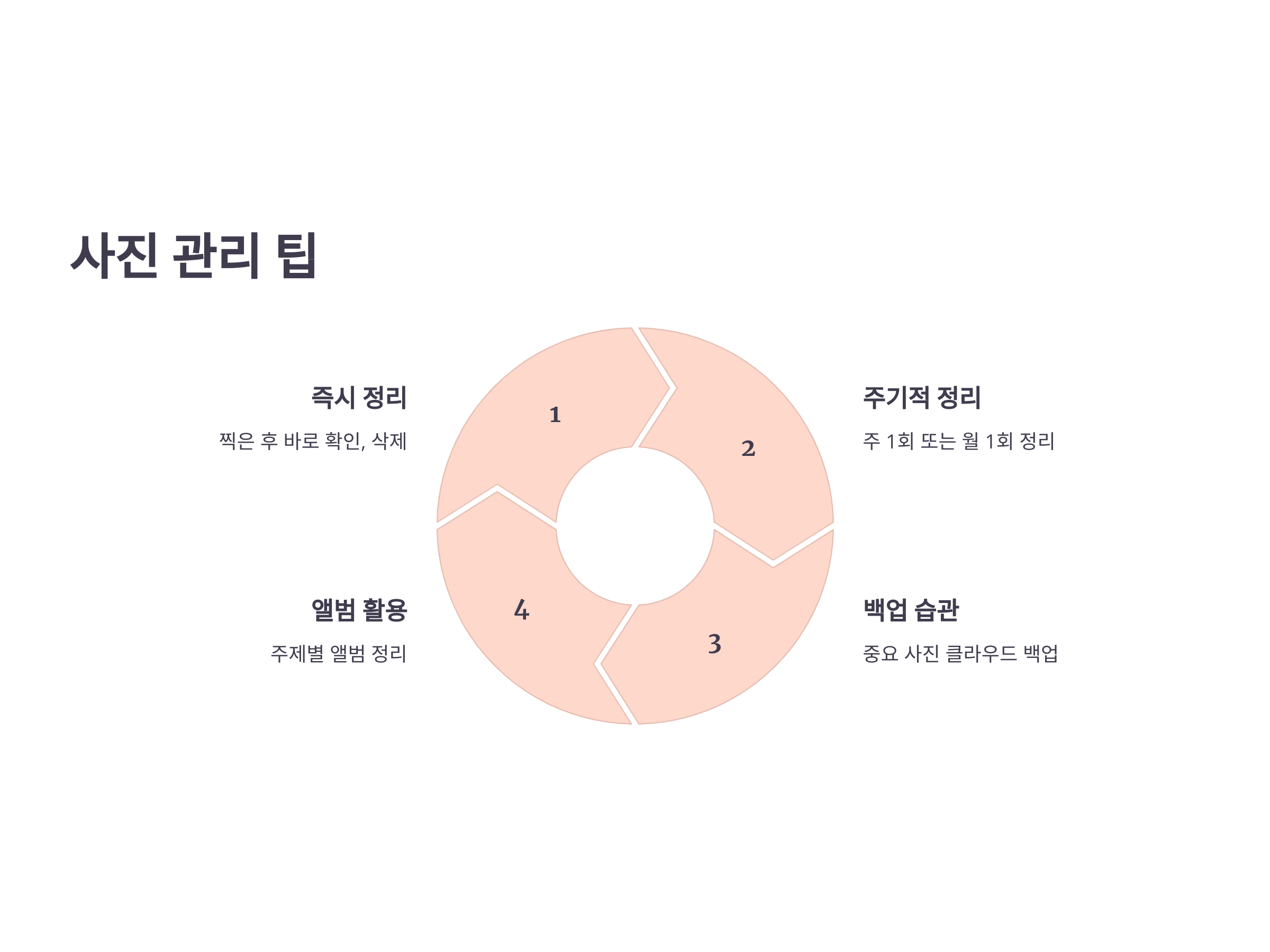 스마트폰의 사진은 클라우드 서비스에 자동으로 백업하고 관리하는 것이 매우 유용합니다. Google 포토, iCloud, OneDrive 등의 클라우드 서비스를 활용하면 사진을 정리하면서 동시에 안전하게 백업할 수 있습니다.