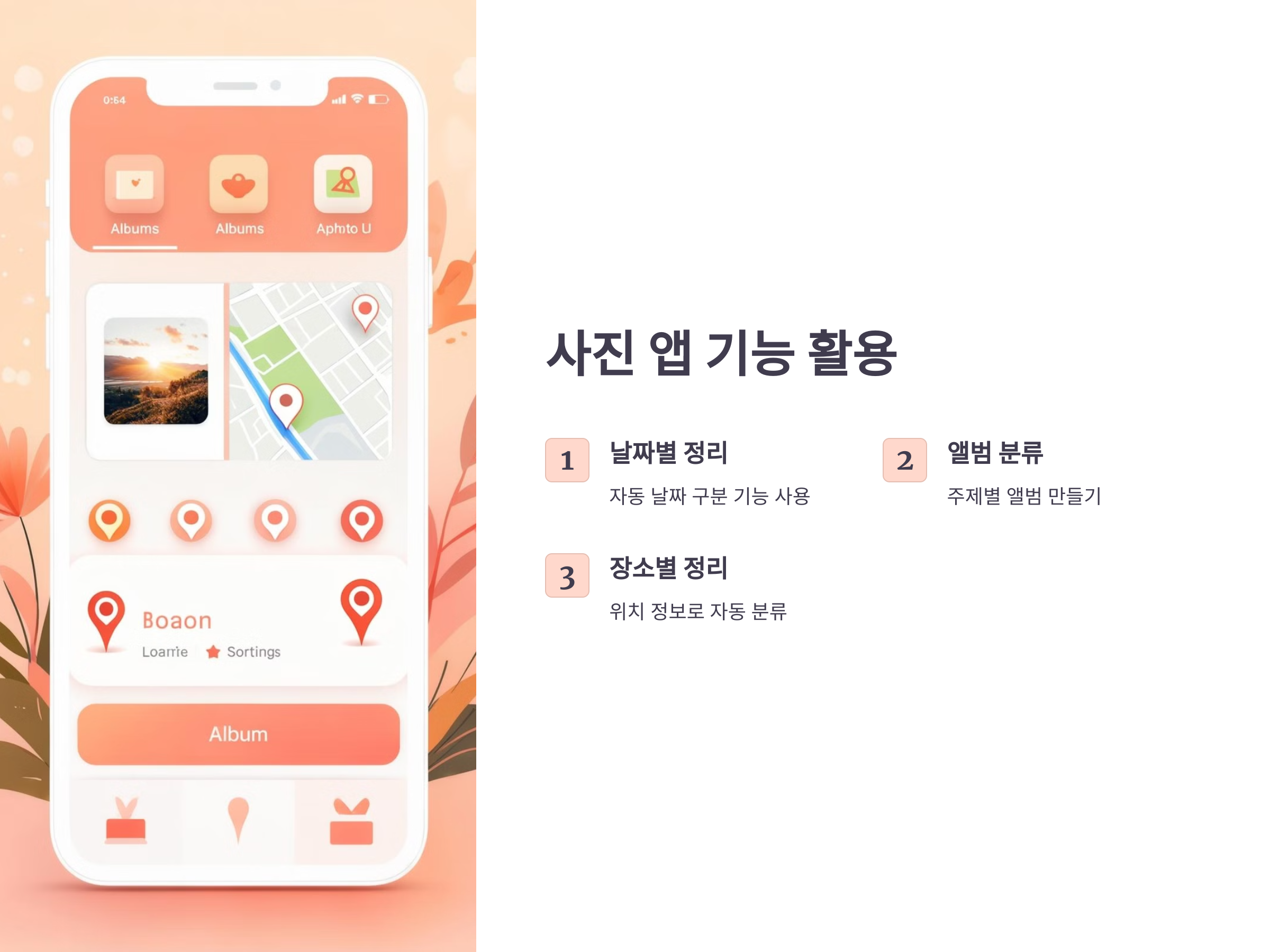 스마트폰의 위치 정보 기능을 활용하면 찍은 장소에 따라 자동으로 사진을 정리할 수 있습니다. 여행 중 찍은 사진을 장소별로 정리하면, 후에 그 장소에서 찍은 다른 사진들을 빠르게 찾아볼 수 있습니다.