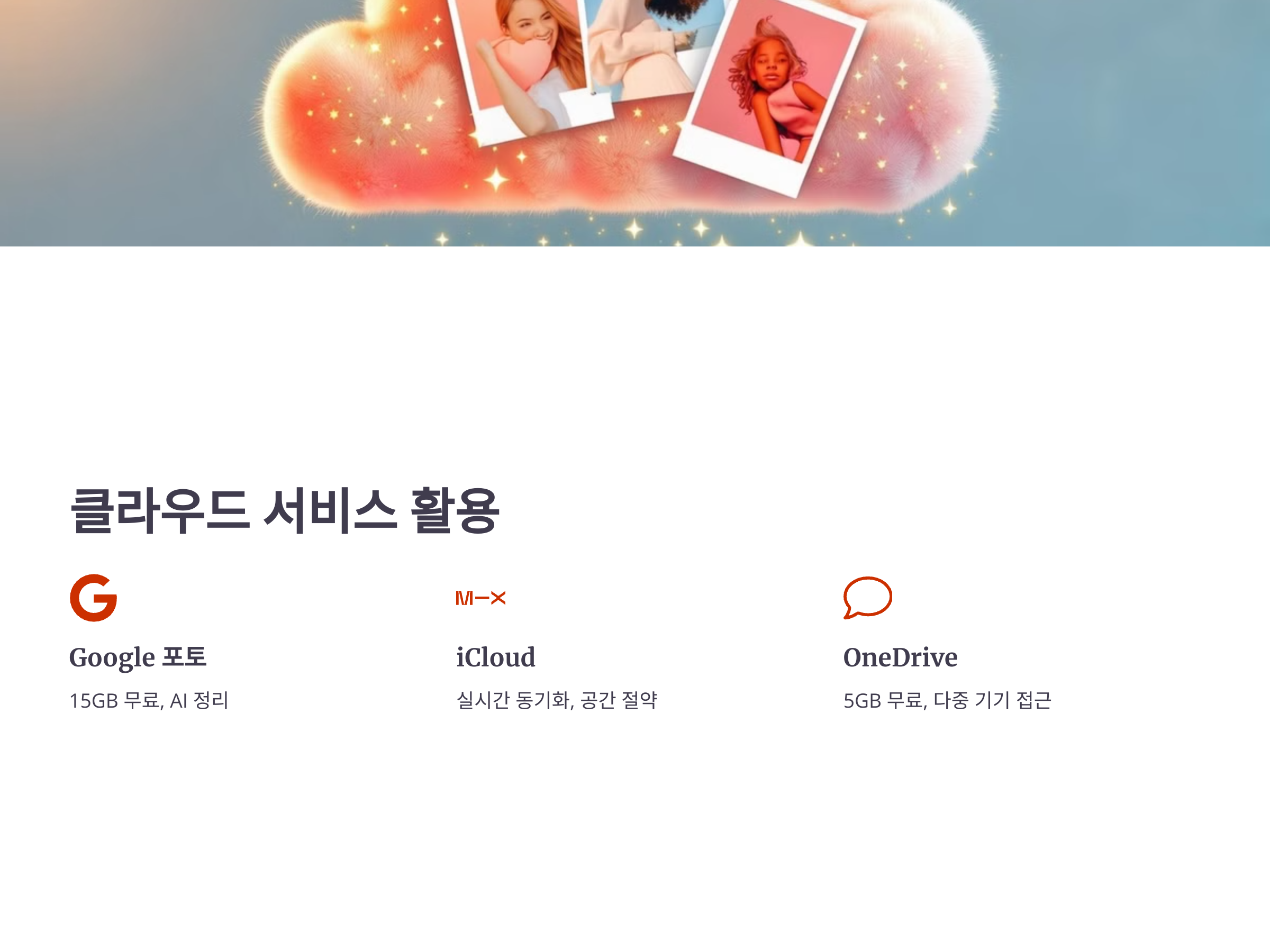 애플 사용자라면 iCloud를 통해 사진을 안전하게 백업하고 관리할 수 있습니다. iCloud는 사진을 실시간으로 동기화하고, 필요한 때에 클라우드에서 다시 다운로드할 수 있는 장점이 있습니다. 또한, iCloud는 사진을 자동으로 최적화하여 저장공간을 절약해 주는 기능도 제공하고 있습니다.