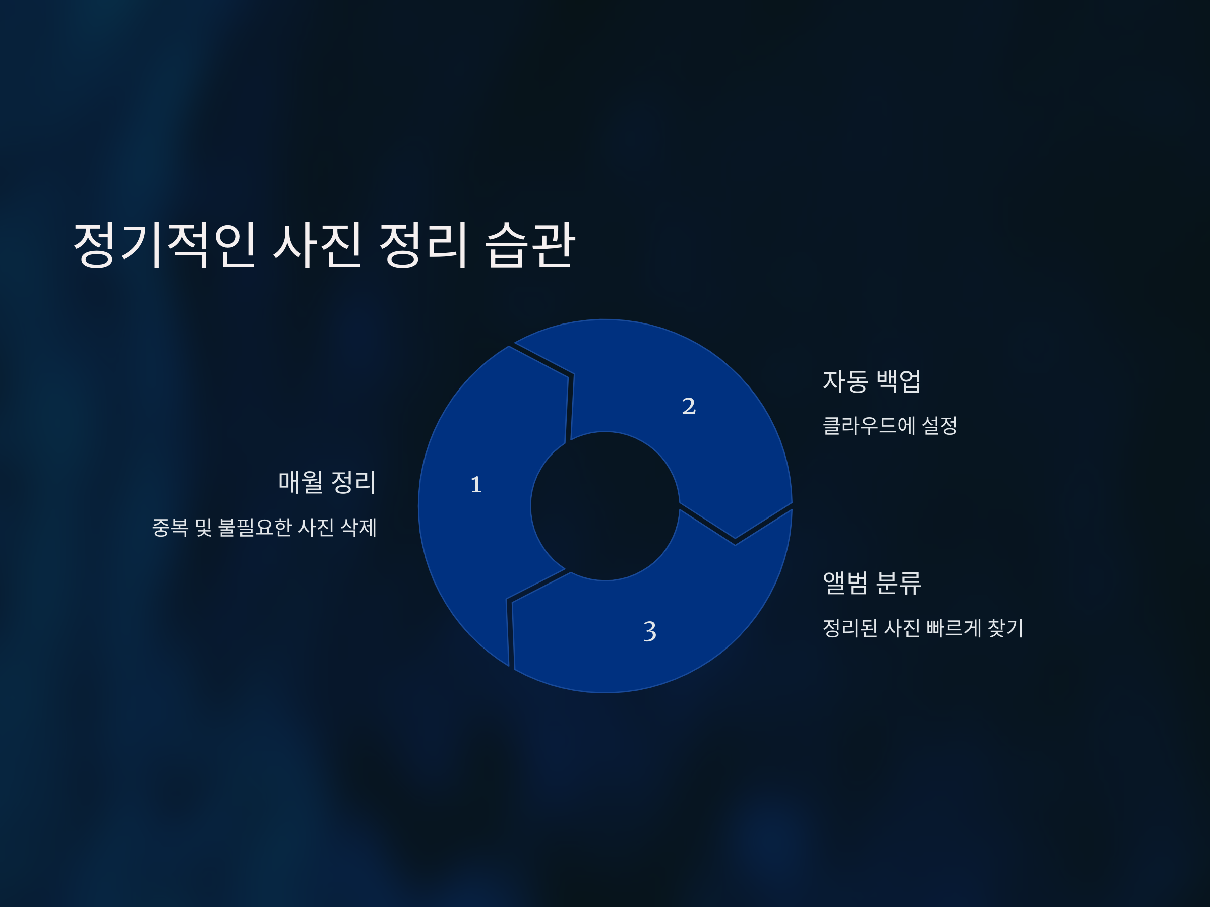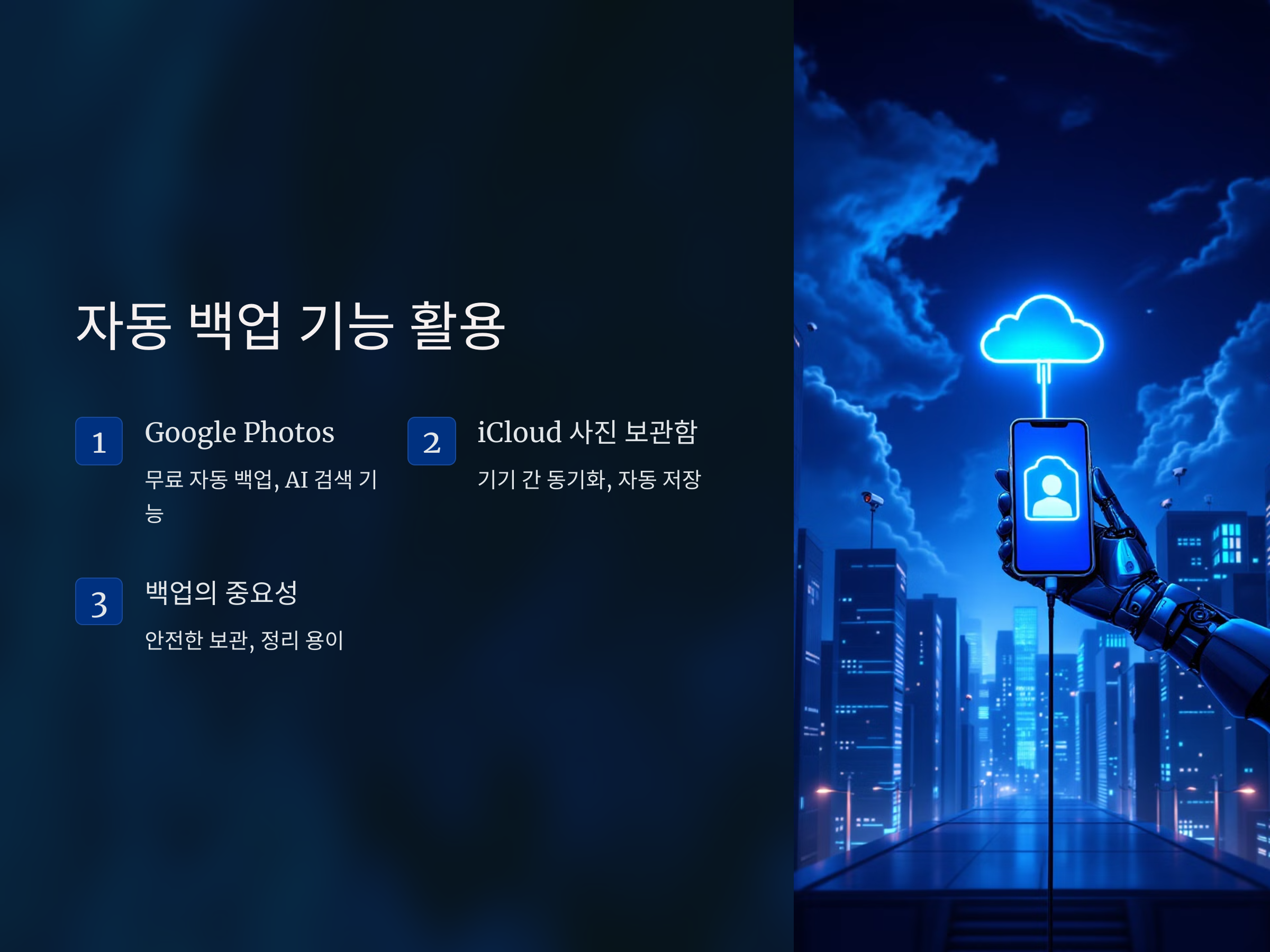 스마트폰에서 사진을 정리할 때 가장 중요한 것은 백업입니다. 사진을 안전하게 보관하고, 필요 없는 사진을 정리할 수 있도록 자동 백업 기능을 활용해 보세요.
