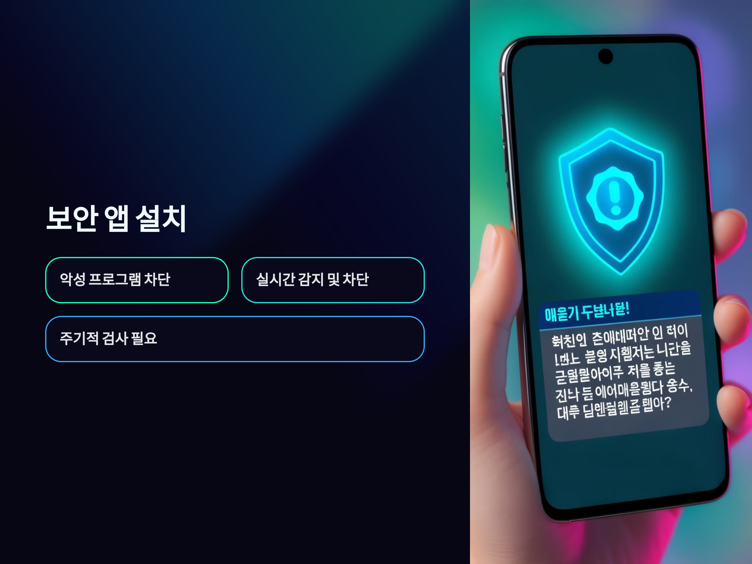 보안 앱은 구글 플레이나 앱스토어에서 다양한 제품을 선택할 수 있습니다. 사용자가 직접 관리해야 하며, 주기적인 검사를 통해 스마트폰을 청결하게 유지해야 합니다.