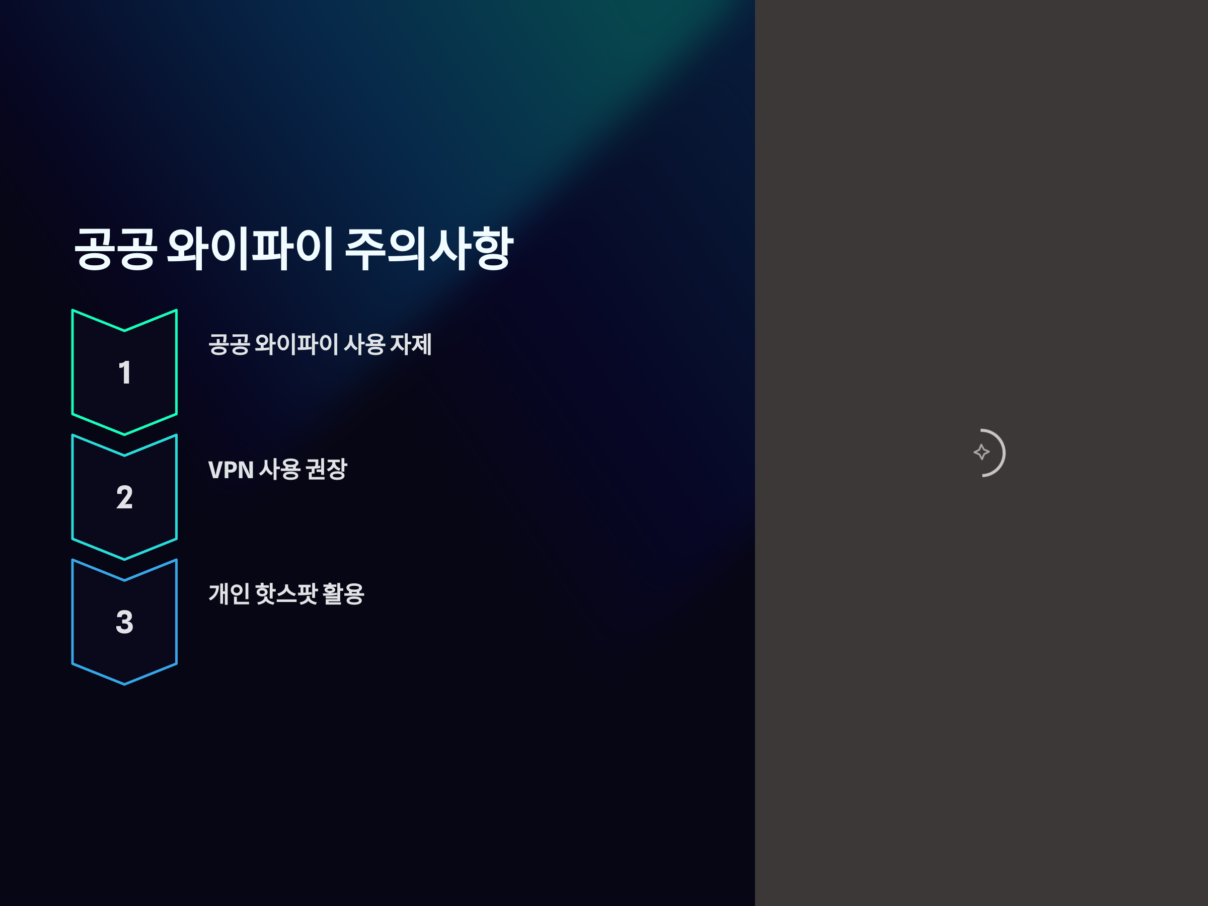 공공 와이파이는 보안이 취약하여 해커가 중간에 접속하여 데이터를 가로챌 수 있습니다. 특히, 은행 업무나 결제 등을 할 때는 공공 와이파이를 사용하지 않는 것이 좋습니다. 개인적인 인터넷 연결을 사용할 수 없는 상황이라면, 가급적 VPN(Virtual Private Network)을 사용하여 보안을 강화하는 방법도 있습니다. VPN을 사용하면 인터넷 사용 시 데이터를 암호화하여 안전하게 보호할 수 있습니다.