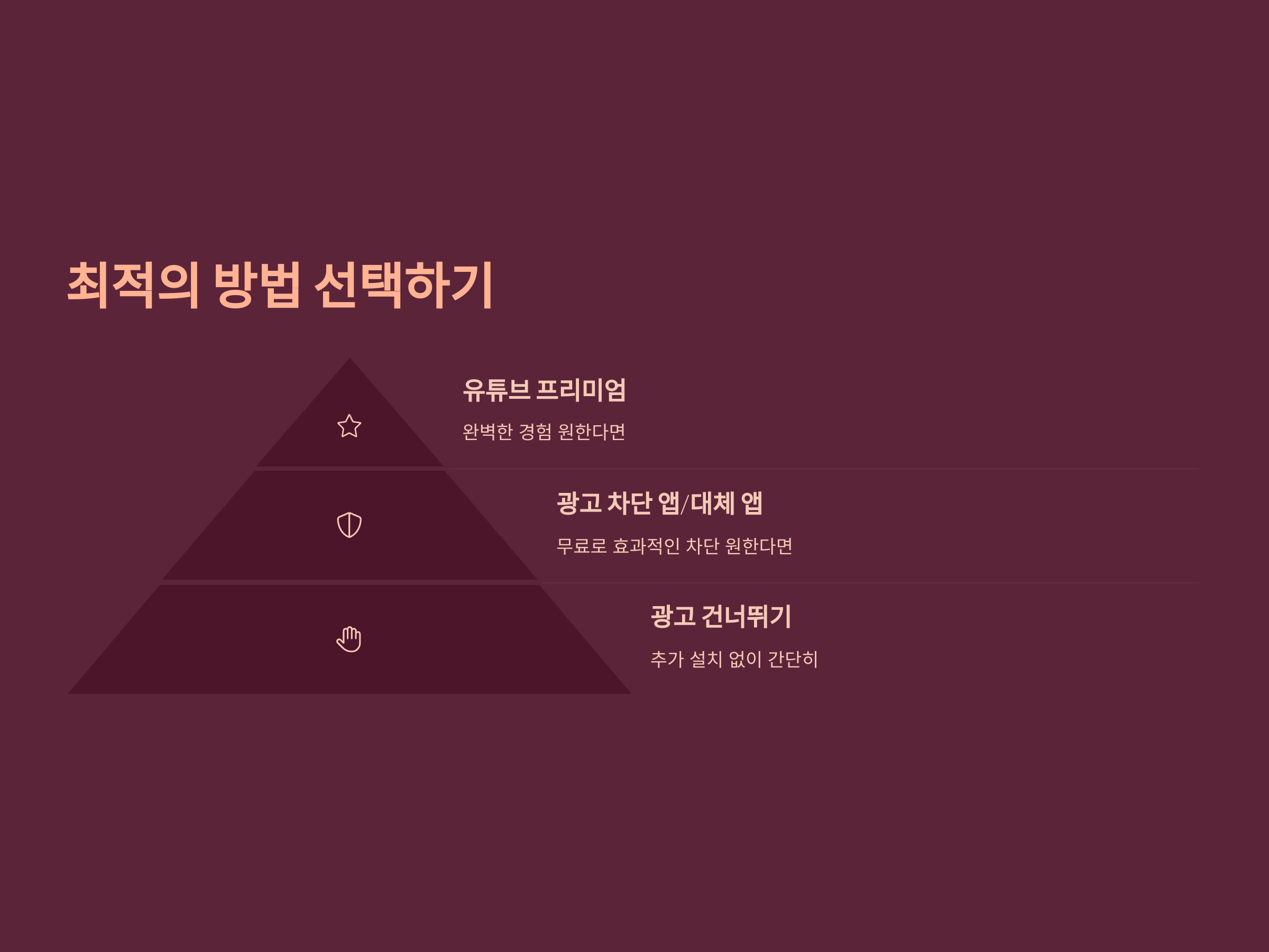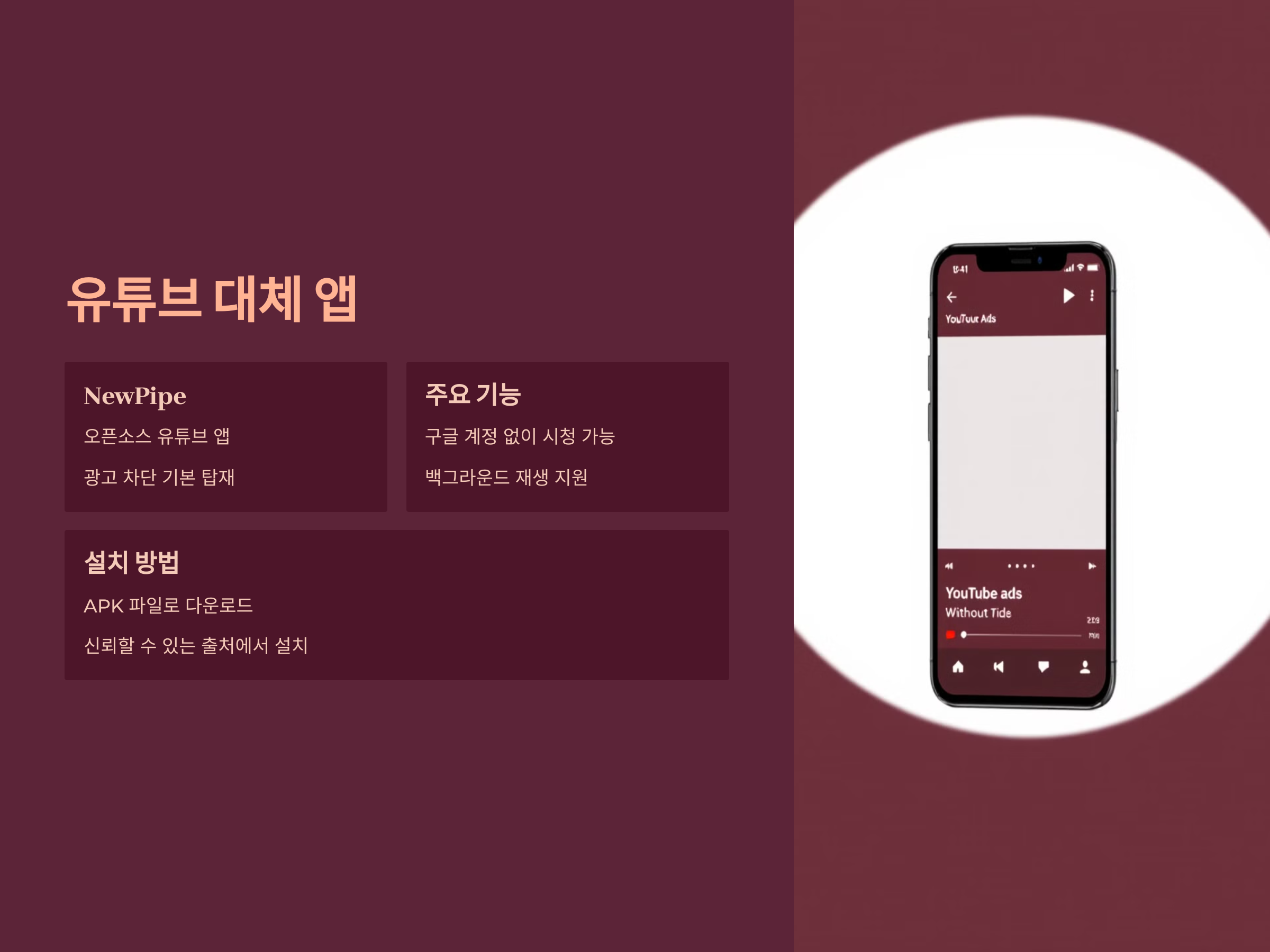 유튜브 대체 앱인 NewPipe와 같은 앱을 활용하면 광고를 완전히 차단하면서 유튜브 콘텐츠를 즐길 수 있습니다. 각 방법의 장단점을 고려하여 자신에게 가장 적합한 방법을 선택하는 것이 중요합니다. 이 글을 통해 스마트폰에서 유튜브 광고 없이 영상을 즐기는 다양한 방법들을 알게 되셨기를 바랍니다.