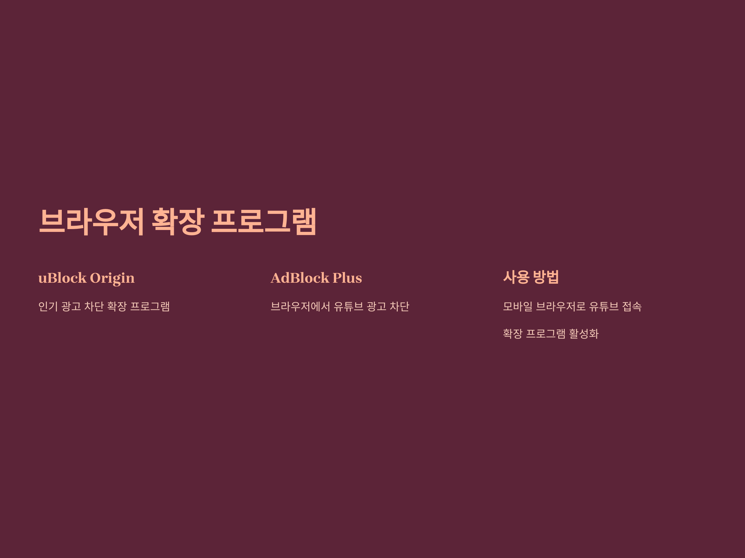 스마트폰에서 유튜브 광고를 제거하려면 브라우저에서 유튜브를 시청할 때 광고 차단 확장 프로그램을 활용할 수도 있습니다. "uBlock Origin"이나 "AdBlock Plus"와 같은 확장 프로그램을 통해 유튜브 광고를 차단할 수 있습니다. 이 방법은 브라우저에서 유튜브를 시청할 때 적용되며, 스마트폰에서 모바일 앱이 아닌 브라우저로 유튜브를 이용할 때 사용 가능합니다.