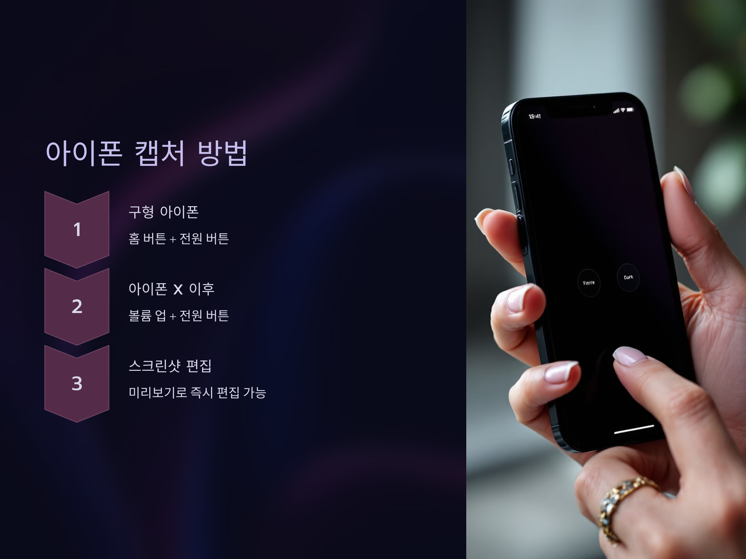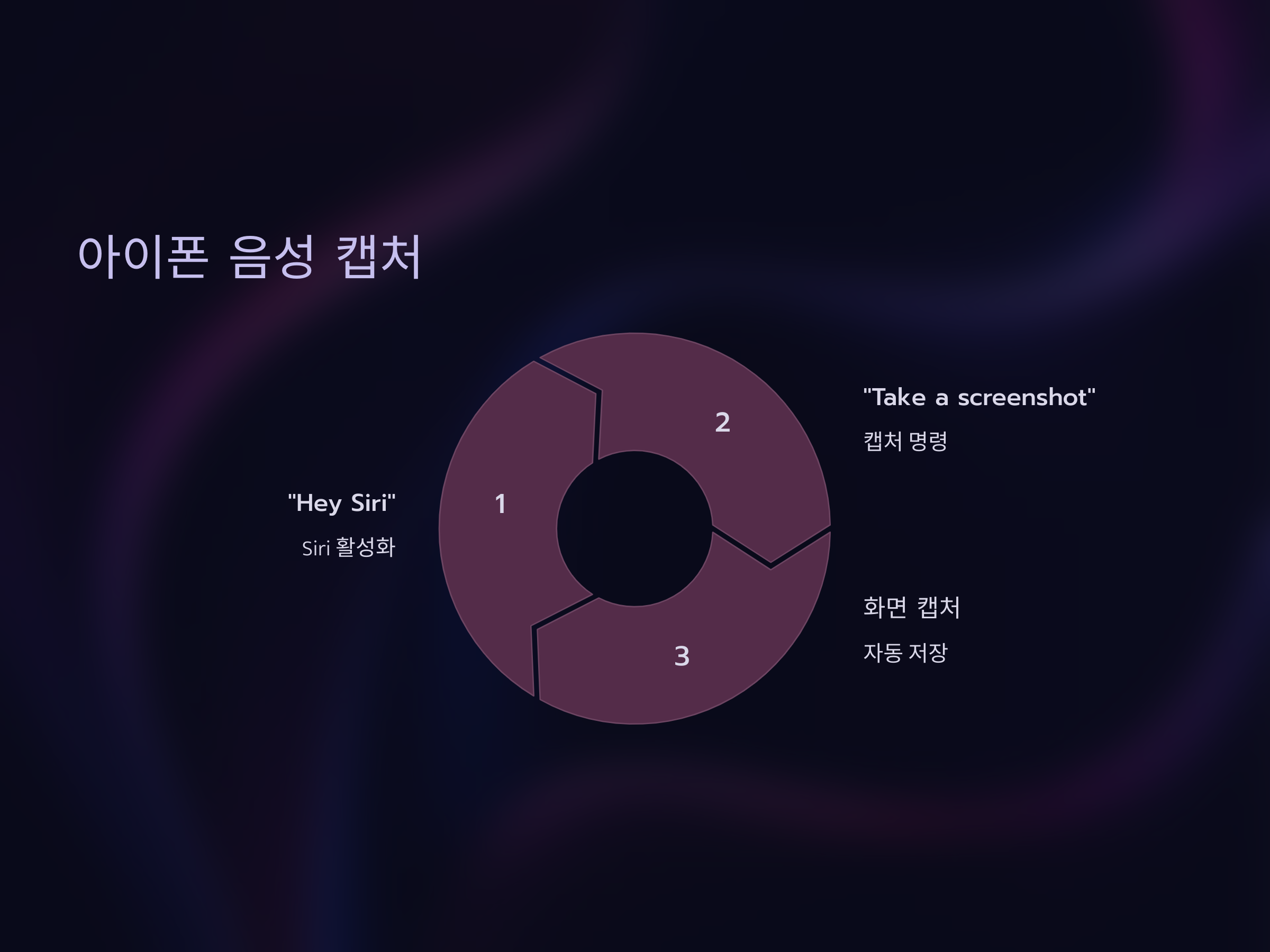 아이폰에서는 Siri 음성 명령을 통해 캡처할 수 있습니다. "Hey Siri, take a screenshot"이라고 말하면 화면 캡처가 됩니다.