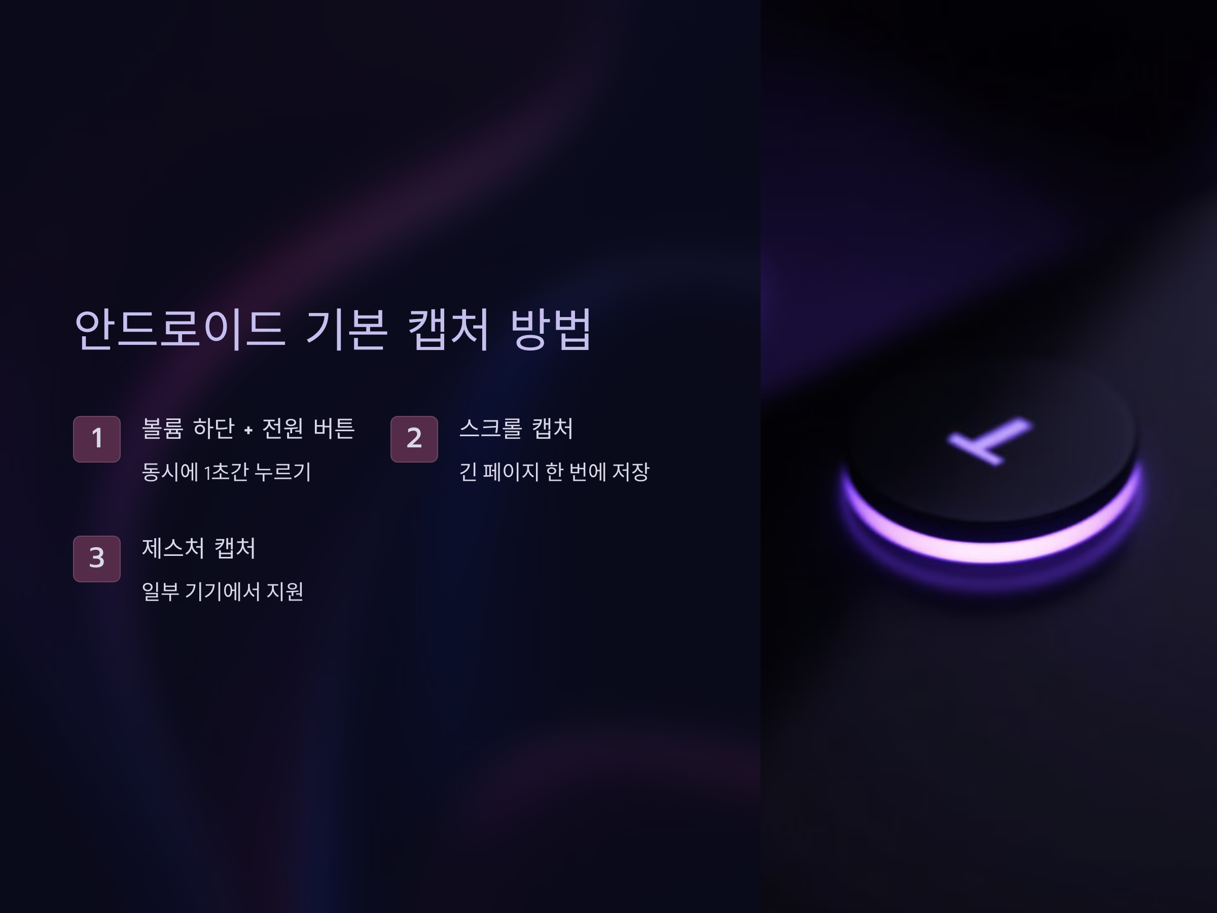 안드로이드 스마트폰에서 화면 캡처는 아주 직관적이고 간단합니다. 대부분의 최신 안드로이드 스마트폰은 동일한 방법을 사용하지만, 일부 오래된 모델에서는 다를 수 있습니다.