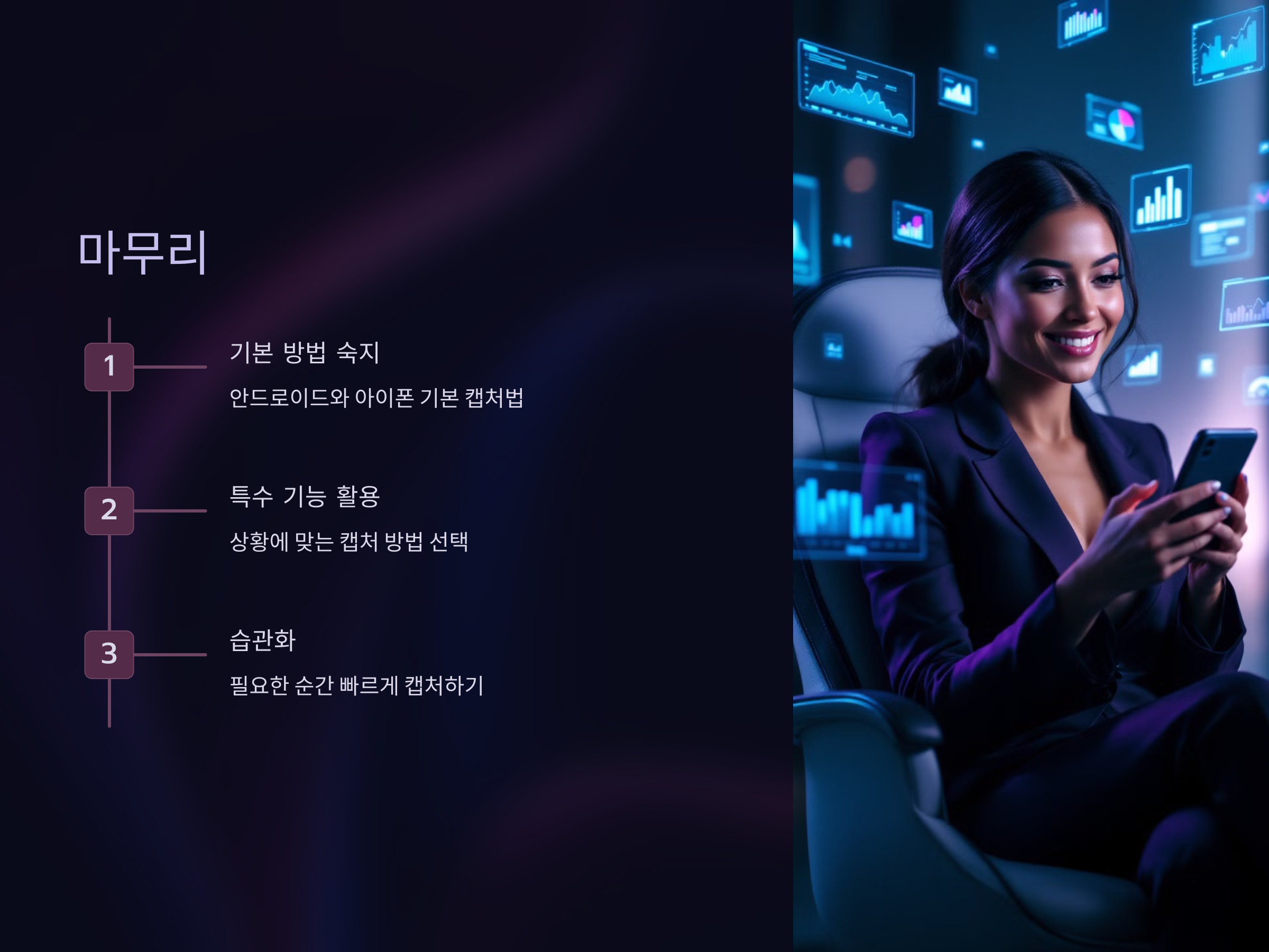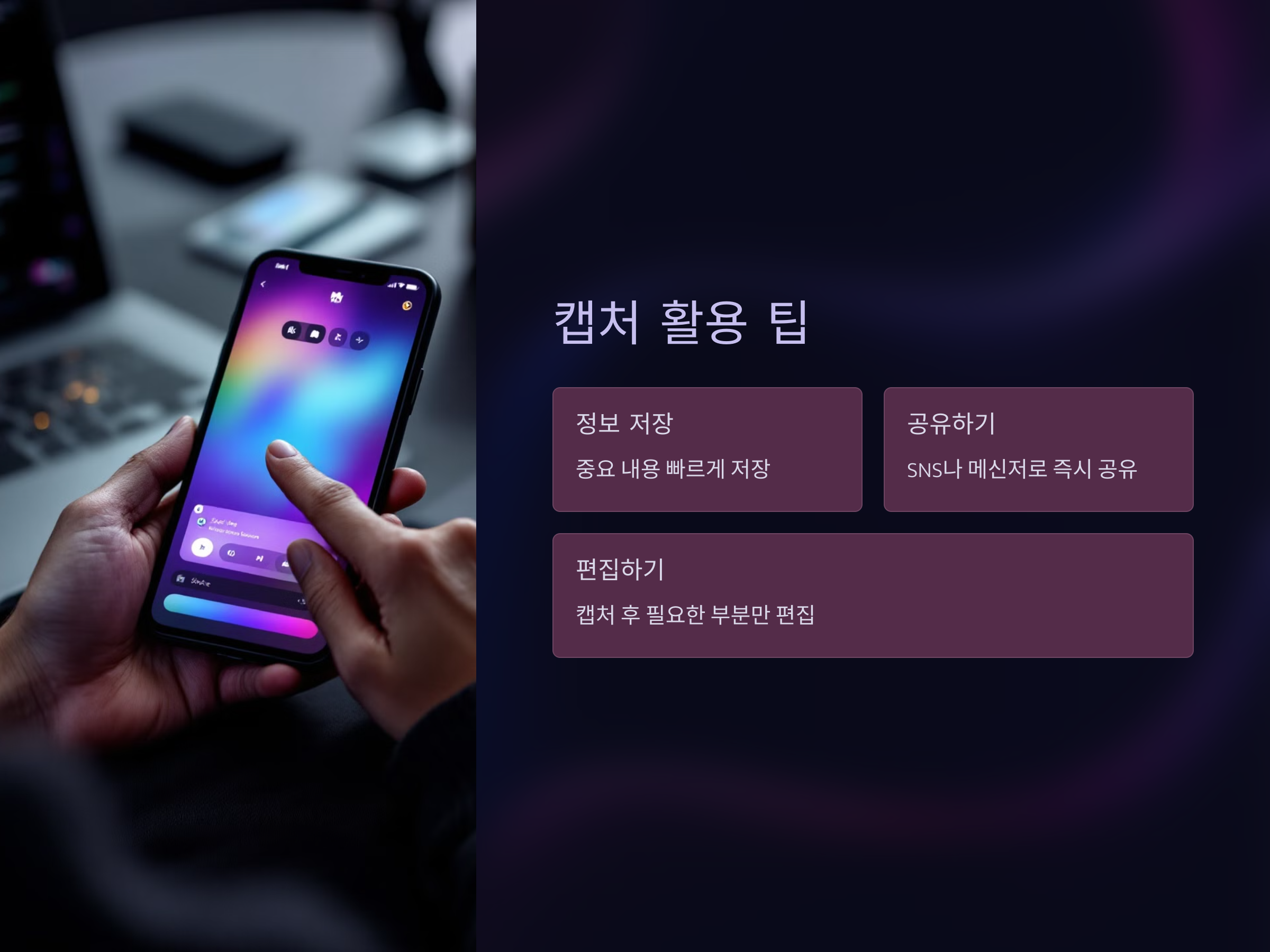 스마트폰에서 화면 캡처는 매우 간단하지만, 다양한 방법을 익혀두면 상황에 맞는 캡처를 할 수 있어 더 유용하게 활용할 수 있습니다. 안드로이드와 iOS에서 제공하는 기본 캡처 방법 외에도 제스처나 음성 명령 등을 활용하면 더욱 편리하게 캡처할 수 있습니다. 화면 캡처를 잘 활용하는 사람은 스마트폰을 더욱 능숙하게 사용할 수 있다는 점, 꼭 기억하세요!